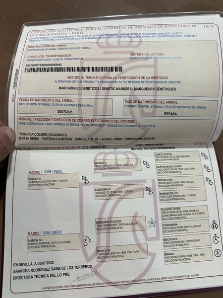 Poulain qui aura 4 ans en juillet, super caractère, très très noble, typiquement espagnol baroque, se déplaçant très bien, faisant des épaules en dedans, des cessions à la jambe, le pas espagnol presque parfait et sortant dans le champ avec une totale tranquillité, que ce soit seul ou accompagné, cheval avec un énorme potentiel.