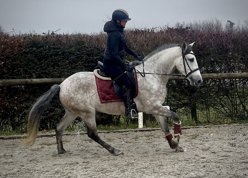 Name: Hispano Breed: P.R.E. (Pure Spanish Horse) Gender: Gelding Date of Birth: June 8, 2020 Age: 5 years Height: 15.8 hh Color: Grey (Dappled) Pedigree: Documentation available Temperament: People-oriented, reliable, intelligent, eager to learn, brave, patient Training/Suitability: Under saddle, Dressage, Leisure riding, Working Equitation Trail Experience: Trustworthy, fearless, comfortable alone or in a group Health: Dewormed, vaccinated, barefoot, eczema-free, teeth checked, osteopathically treated Stabling: Box, paddock Special Features: Very comfortable to sit on, shoe and load-trainable, herd-compatible Please note that these characteristics are based on our personal assessment and do not constitute guaranteed traits. Price: €7,900 (gross price) Have we sparked your interest? To give you a better impression of Hispano, we are happy to send you a video of him riding. Of course, we are available for a detailed description of the horse, personal consultation, and to answer all your questions via phone. Please feel free to contact us anytime via WhatsApp message or call us at: +49 151 19487595 Our phone hours are daily from 7:00 AM to 1:30 PM and again from 8:00 PM. We look forward to hearing from you! A clinical or radiological purchase examination can be carried out by your veterinarian of choice. Hispano can be safely and comfortably delivered to his new home. We take care of all preparations and transportation so your new horse arrives stress-free, well cared for, insured, and in good health. Currently, we offer a carefully selected range of horses for sale. With us, you are sure to find your dream horse. Feel free to visit our website at: www.marvinsroyalhorses.de. Dear customers, we would be happy to introduce you to our horses and offer grooming, tacking, lunging, ground work, as well as trial riding in the riding hall, on the arena, or in the field to get to know your new family member better. This service costs €40 per horse, with each additional horse €30, and will be refunded upon purchase. Our address: Ferdinand Grube 50 53577 Neustadt-Wied Google Maps: marvinsroyalhorses
