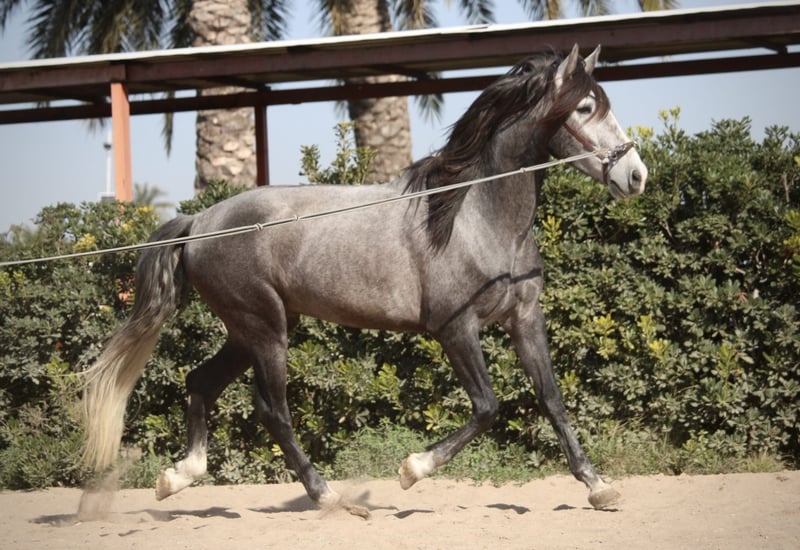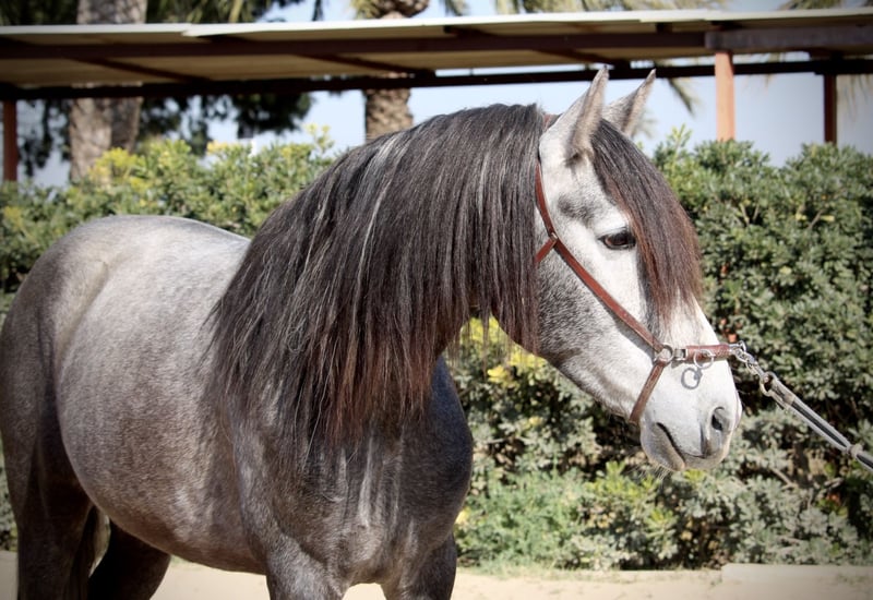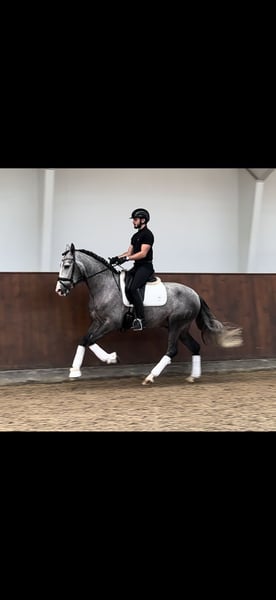 They say you can't ride on papers... but you can see the papers on this noble dream horse. The young gelding (already gelded on site) DIGITAL G reveals his noble origins through his perfect conformation, noble head and expressive gaits. A pure Granda (Gestüt Granda Losada) bred young PRE with very big names in his pedigree! This stud stands for elegance, quality of movement and functionality. The young gelding has already been broken in a little and is still in training. His character is intelligent, open-minded and willing to learn. He will certainly grow a few more centimeters, so that the expected final height is approx. 1.65m. Full ANCCE papers. Location Spain.