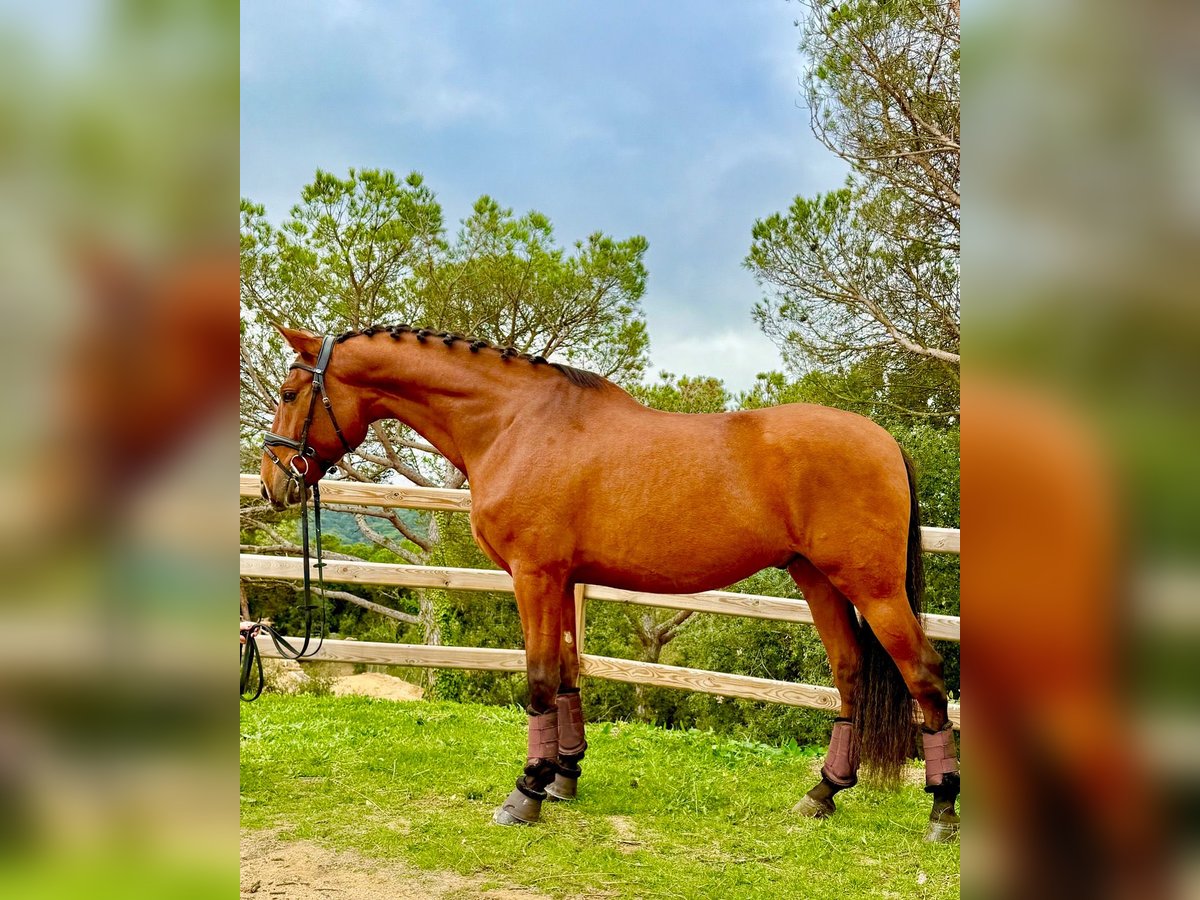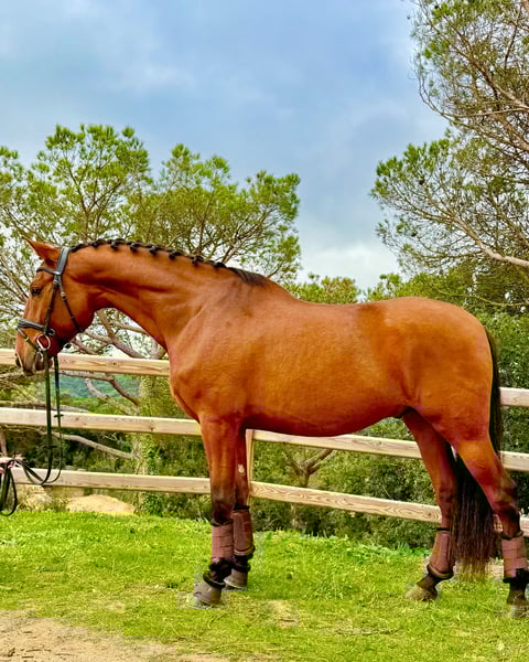 Registered PRE with ANCCE – full papers available + PYRO FREE This bay PRE gelding, born in 2020 and standing 166 cm, is a promising dressage prospect suitable for an experienced or professional rider. He is currently working at a 5-year-old level and has started flying lead changes, demonstrating good balance and a willingness to learn. Due to his sensitivity and stage of training, he is not suitable for amateurs. He requires correct riding and continued professional development to reach his full potential. An interesting opportunity for riders seeking a young PRE to further develop for dressage sport.