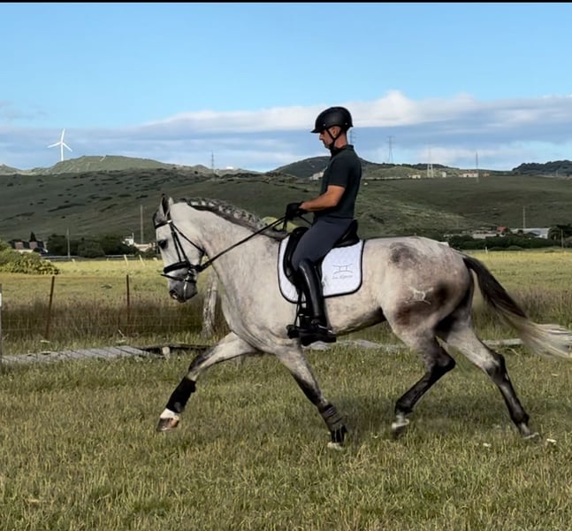 5-jähriger, kastrierter PRE-Hengst. 1,75 m Stockmaß. Sportliche Statur. Drei sehr gute Gangarten. Ideal für die Dressur. Gewöhnt an Ausritte ins Gelände. Mit viel Arbeitswillen und leicht zu handhaben. Ohne jegliche Laster und mit sehr gutem Charakter.