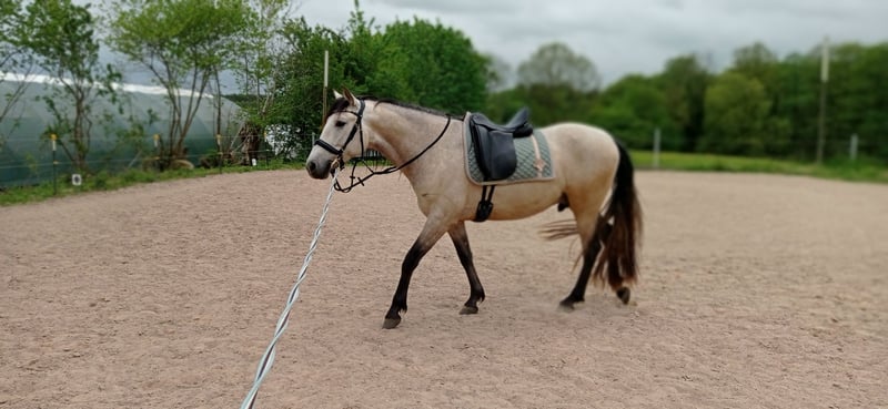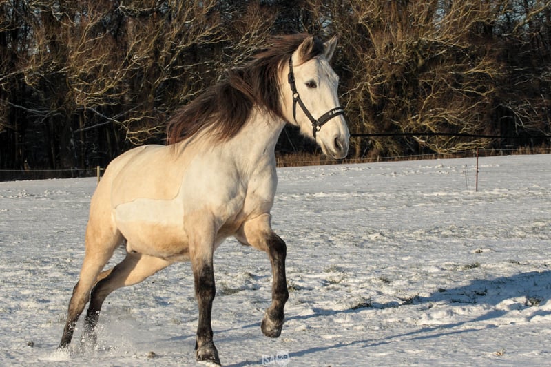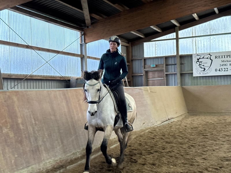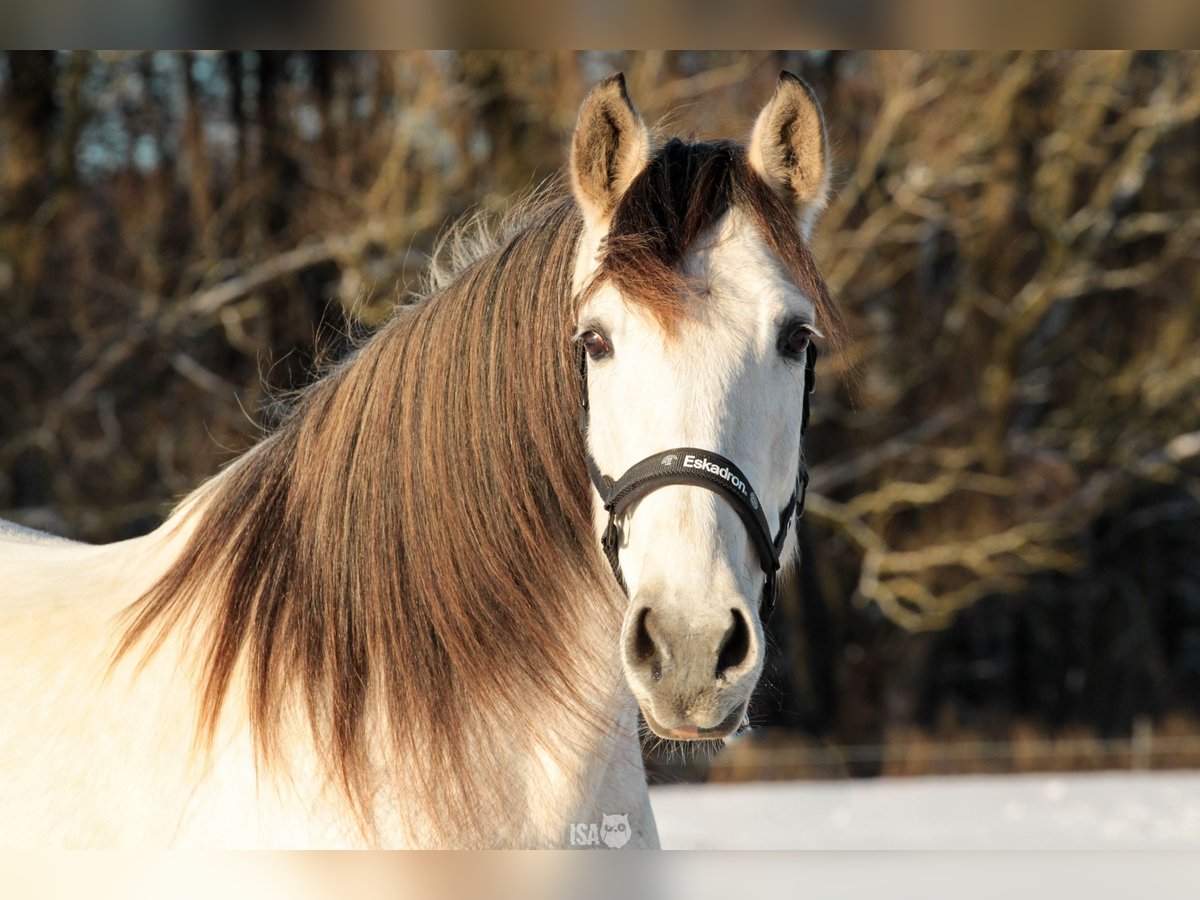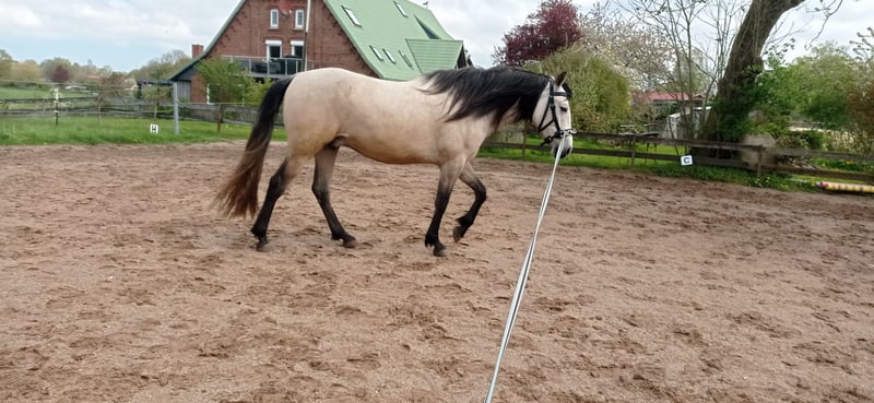 6 jähriger Wallach im besonders hellen Bayo Ton. Im Sommer cremefarbendes Fell, im Winter fast weiß. Geritten in den Basics (A- fertig/Anfänge L-Lektionen). Start in die Seitengänge und einfachen Gallopwechsel. Spanischer Schritt vom Sattel, wie auch vom Boden aus. Luft nach oben, jedoch fehlt die Zeit um es aktuell zu fördern. Er ist nicht ausschließlich für Anfänger oder schwache Reiter geeignet. Junge Mädchen mit Talent und Können sind kein Problem. Er bringt Charakter und tagesbedingt „Go“ mit. Er deckt große Reiter sehr gut ab, da er jetzt schon stark im barocken Stiel steht. Reiterin auf den Fotos 184cm Groß. Er selbst hat ein Stockmaß von 1,60m. Mit 1 Jahr wurde er aus Valencia importiert. Militärische und Cartujanische Linien im Stammbaum enthalten. Keine Allergien, keine OPs,…. Beherrscht zirzensik Elemente- Anfänge der Piaff, Kompliment, Seitengänge Trab,… Er lässt sich gut über Gewicht reiten. Er besitzt im Trab Campaneo, welches je nach Tempo mehr oder weniger ausgeprägt sichtbar ist. Jedoch macht es ihn auch „sitzbequemer“. Unter folgenden Link siehst du seine Abstammung. https://www.lgancce.com/lgpreancce/asp-publico/arbolGenealogicoPRE/ConsultarArbolGenealogicoPRE.aspx?ID=AxawRK0rW/U= Er steht auf dem Anhänger wie ein Profi, beim Verladen fehlt ihm manchmal die Routine. Er steht beim Tierarzt / Hufschmied brav und ruhig, war aber bisher immer Barhuf unterwegs. Er geht alleine ins Gelände, kennt Trecker, Autos, Hunde,… Pro Ritt erhebe ich eine Gebühr von 25€. Bei schlecht Wetter, bin ich auch gewillt, ihn zum Probereiten, in eine Halle zu fahren. Vieles an Equipment vorhanden, welches mit erworben werden kann, aber nicht muss. Wir könnten ihn auch in sein neues Zuhause fahren, da wir einen eigenen Anhänger besitzen. Sein Halbbruder zeigt die guten Anlagen im barocken Reiten und in der Zucht im Gestüt Floggensee als Cremello. Der Vater „Epon de Vale“ war sehr gefragt und viel im Deckeinsatz in Spanien. Ganz klar, Platz vor Preis für das neue 7 Sterne Zuhause.