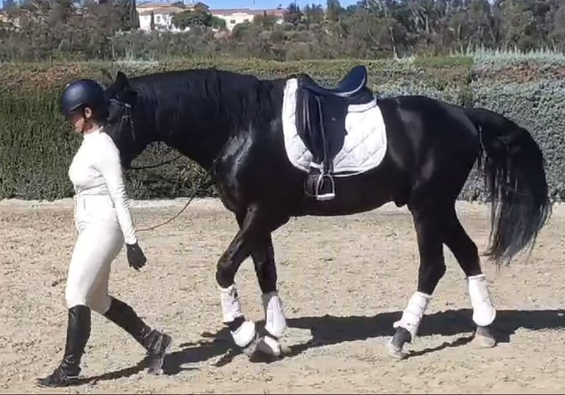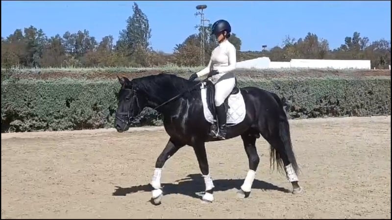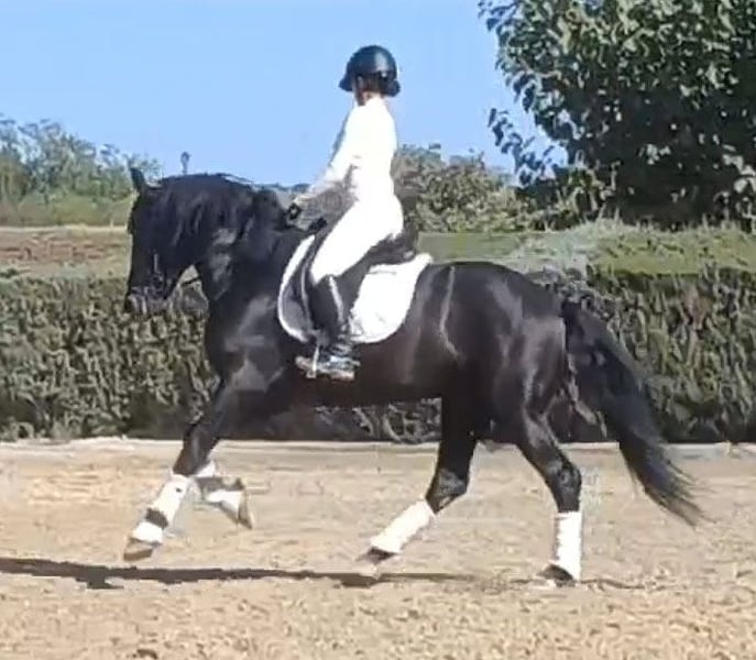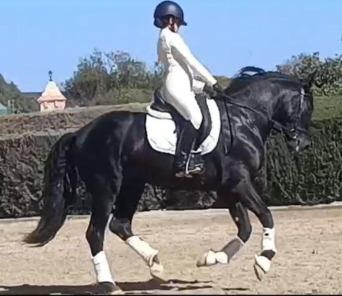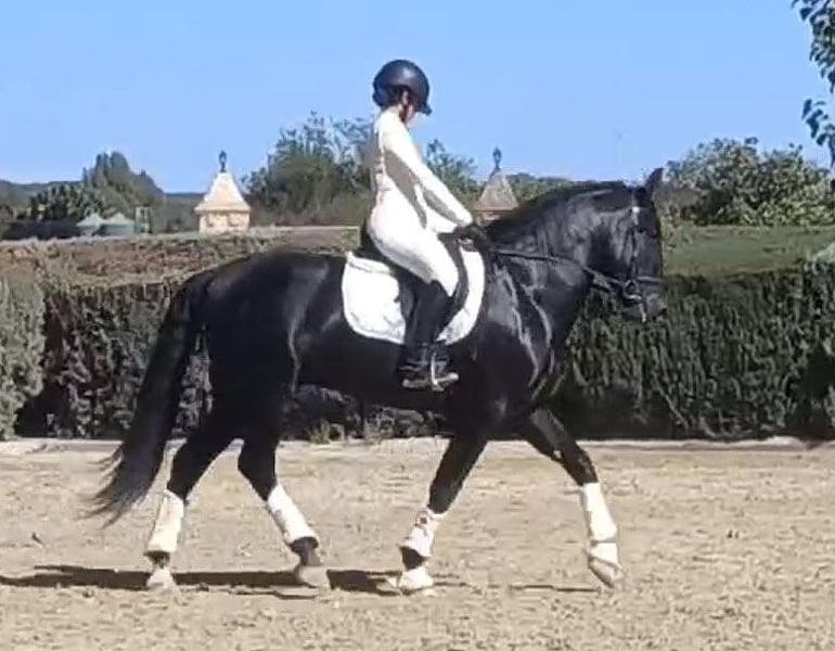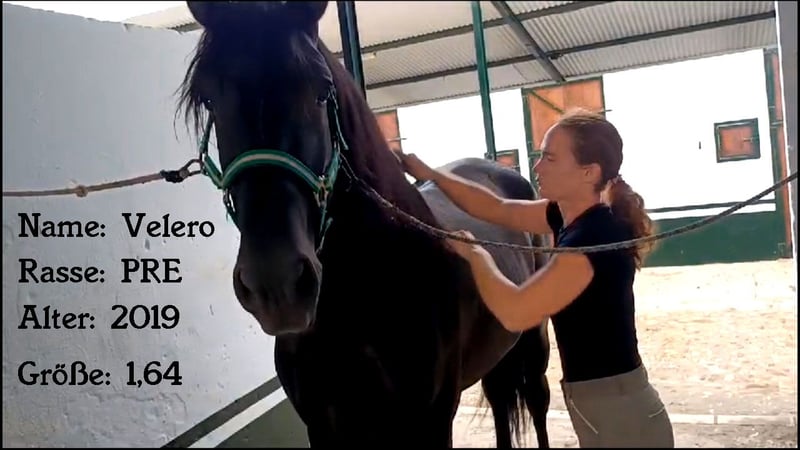 **Sale ad: Elegant PRE stallion for sale** We are offering an impressive PRE stallion for sale. This noble black stallion was born in 2019 and impresses with his elegant appearance and harmonious conformation. With a height of 164 cm, he presents himself as an ideal partner for the ambitious leisure rider. Velero is not only a particularly beautiful horse, he also has a very good character. Which is not necessarily the norm for Spain, he has been given all the time he needs to grow and has only been under saddle for just under a year. He is super sweet and is presented here in the video by a 14-year-old riding student. Velero is almost pure Yeguada Militar bred and has big names like Leviton and Remache in his pedigree. Velero can still be ridden or gelded on site and of course you can visit and test ride him at any time. Velero is based in Huelva/Spain. We are happy to help with transportation. An acu can of course be done on site.
