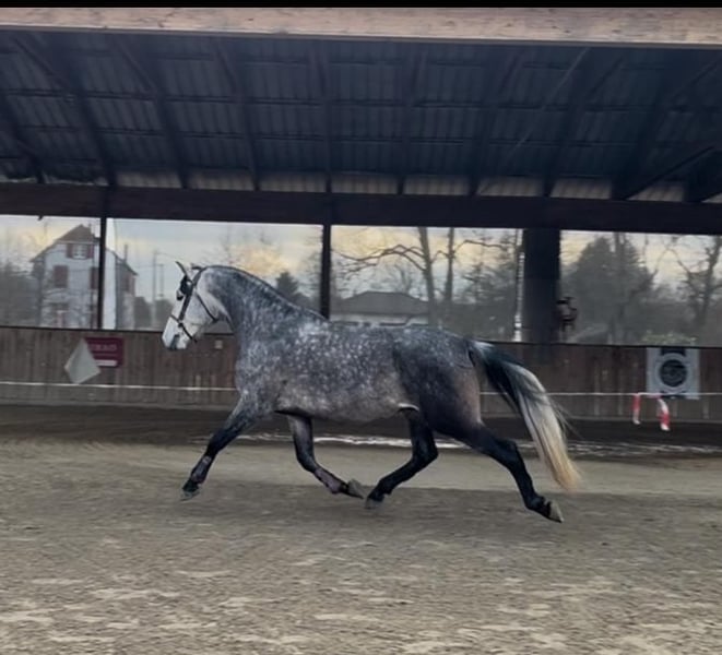 Hübscher 6-jähriger Hengst reiner Spanischer Rasse, barocke Abstammung Zum Verkauf steht dieser wunderschöne barocke Hengst, der zahlreiche positive Eigenschaften mitbringt und das Potenzial hat, Ihr Traumreitpferd zu werden – sei es für Dressurwettbewerbe, als zuverlässiger Begleiter bei Ausritten oder für Freilauf-Show. - in Frankreich geboren und aufgezogen, mit sehr guten Papieren, sein Vater ist regelmäßig in Dressurprüfungen platziert - kastriert im Alter von dreieinhalb Jahren, lebt daher problemlos in einer Herde mit Hengsten, Stuten und Ponys aller Altersklassen; er integriert sich harmonisch, ohne dominant oder unterwürfig zu sein - seit drei Jahren kastriert, somit keine Sorge mehr über Verlust an Kraft in Vorder- und Hinterhand, Fellverlust oder Abbau seiner beeindruckenden barocken Morphologie - groß gewachsener Hengst mit 1,66 m Stockmaß, sehr kräftig, mit gut bemuskelten Gliedmaßen, ausgezeichneter Rückenpartie (quadratischer Körperbau), starke Vorder- und Hinterhand, sehr tragend und kraftvoll, mit viel Raum unter dem Bauch für seitliche Bewegungen - mit wunderschönen, schwungvollen, runden, kraftvollen Gängen - beeindruckender Sprung, berührt niemals eine Stange; das Springtraining wurde ausschließlich im Freilauf durch seine Besitzerin durchgeführt - lebt seit jeher barfuß, wurde nie beschuht, braucht keine Hufeisen und wird auch in Zukunft keines benötigen. Sehr harte, schwarze Hufe mit stabilem Fundament. Auch auf Kies, Erde, Matsch, Wasser oder Sand im Reitplatz fühlt er sich wohl - wurde behutsam körperlich und geistig großgezogen, ab drei Jahren eingeritten, mit vier Jahren begann er mit Ausritten, alleine oder in Gesellschaft; das Training startete erst im Jahr seines fünften Lebens - besitzt drei echte, gute Grundgangarten (beim Trab waren die Galopper im Hintergrund, wenn seine Besitzerin mit ihm Trabritte machte, und im Schritt war er stets weit vorne) - hat eine natürlich gut ausgerichtete Halslinie, arbeitet stets im richtigen Tempo, mit oder ohne äußere Hilfen, an der Longe oder unter dem Reiter, auch in der Freiarbeit - lässt sich sehr gut im Anhänger transportieren (seine Besitzerin fuhr manchmal alleine, um Freunde zu treffen, alles verlief problemlos) - unternimmt alleine oder in Gesellschaft entspannte Ausritte, kann jedoch bei plötzlichem Schreck kurz springen, bleibt aber stets bei seinem Reiter, schaut, überlegt und setzt seinen Weg fort - beim Aufsteigen bewegt er sich kaum, kommt sogar von selbst an die Seite des Reitplatzes, kann sowohl vom Boden aus als auch links und rechts aufgesessen werden - sehr sanfter, sensibler Maul, reagiert fein auf die Hilfen, reicht die Beine nur leicht, um Hüft- oder Schrittdrehungen auszulösen, oder die Gangart zu ändern - sehr lernfähig, intelligent, menschenbezogen, wird eine enge Bindung zum Reiter aufbauen und die Zusammenarbeit mit ihm äußerst angenehm machen, er gibt alles, um Freude zu bereiten - im Grundausbildung bereits solide Grundlagen, vor allem seitliche Bewegungen - unkompliziert und lieb im Umgang, lässt sich problemlos duschen, die Hufe auskratzen, die Mähne pflegen – macht ihm Freude - kann nachts in der Box stehen und tagsüber auf der Weide verbringen, oder ganz auf der Weide mit Unterstand, Wasser und Heu nach Belieben - nie verletzt, mit tierärztlicher Untersuchung gekauft, ohne Röntgenaufnahmen (auf Wunsch können diese auf Kosten des Käufers gemacht werden) - keine Hautprobleme, allerdings sollte er im Sommer vor Insekten geschützt werden, da ihn diese stören können. Er war stets ganztägig auf der Weide mit Fliegenmaske und entsprechender Behandlung, was ihm gut passt - vollständig geimpft, entwurmt, zahnärztlich sowie osteopathisch behandelt - respektiert die Weidezaungrenzen, lässt andere Pferde ein- und auslaufen - kommt bei der Suche auf die Weide problemlos zu uns - bleibt zuverlässig an der Anbindestange, am Pfosten, im Anhänger, ohne zu ziehen - sensibel und feinfühlig, im positiven Sinne, jedoch nicht für einen Amateur geeignet, da er viel Blut und Kraft hat. Er benötigt einen erfahrenen, ruhigen und selbstsicheren Reiter - hat eine vielversprechende Zukunft, solide Grundausbildung (zu Fuß und unter dem Sattel), ausgeglichenes Wesen (er möchte stets sein Bestes geben, versuchen zu verstehen, und ist offen für echte Kommunikation), ohne jegliche Macken, wurde nie frühzeitig gezwungen, hat alle Chancen vor sich - braucht einen echten Reiter, idealerweise mit Erfahrung im Umgang mit iberischen Pferden - bester PRE-Hengst, den seine Besitzerin bisher hatte - Grund für den Verkauf: gesundheitliche Probleme der Besitzerin nach einem Autounfall