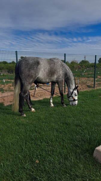 Edad: 6 y medio Carta ANCCE Altura: 1,66 aprox. Capa: Tordo Castrado De Finca Lo Tacón y Yeguada Bejar. Doma Clásica. Cesiones, apoyos, espaldas y grupa. Empezado a hacer cambios. Salidas al campo. Iniciado a la grupa.
