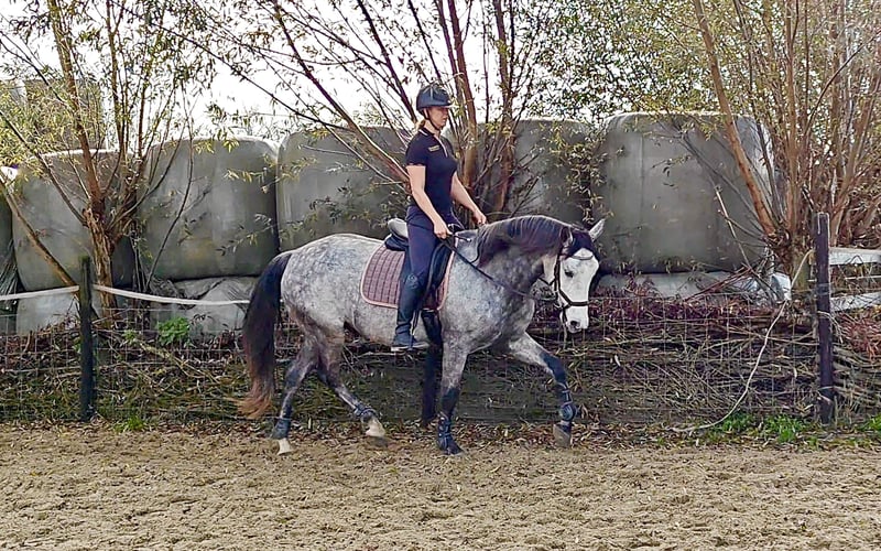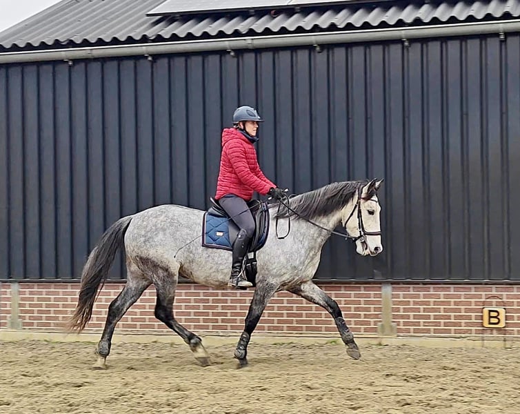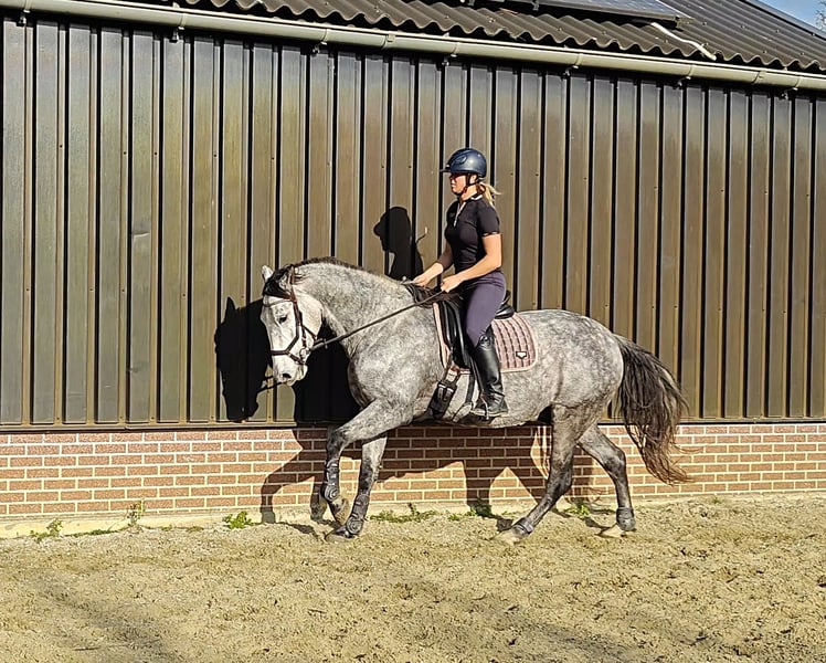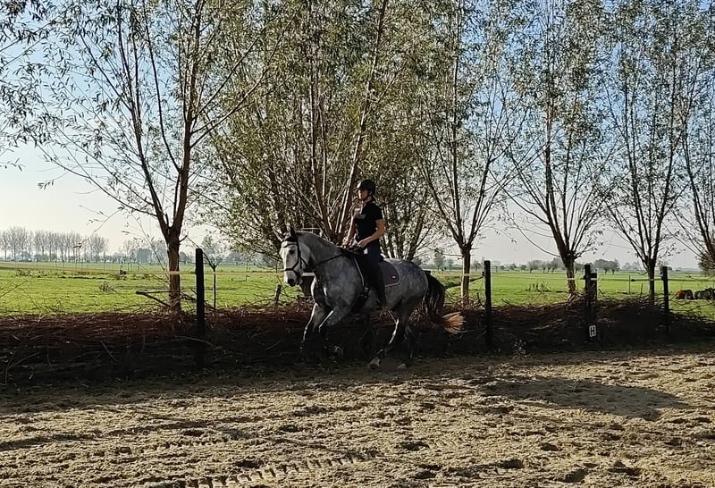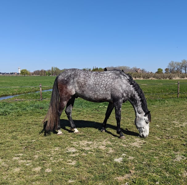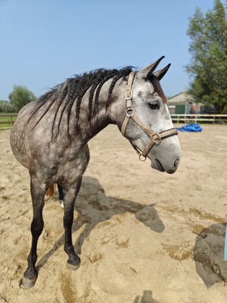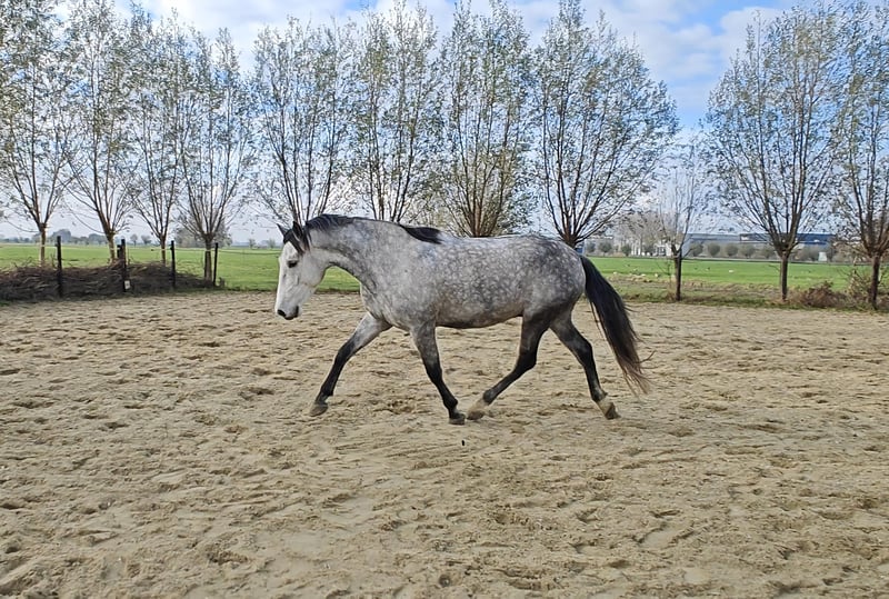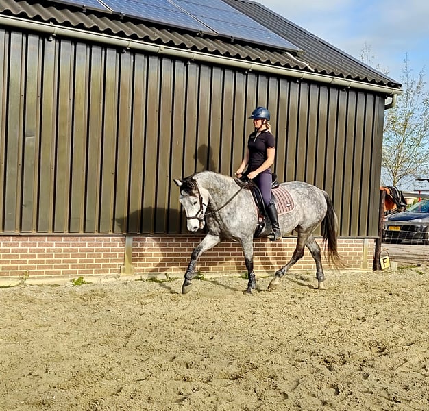 For sale: a well-behaved 6-year-old PRE gelding with a carta, approximately 1.67 m. He arrived in the Netherlands as a foal and has always been handled gently. Bolero is a super gentle gelding who enjoys playing with other horses and is always eager to join in activities. He is calm and well-mannered, but also sensitive. Therefore, I am looking for someone who trains him in a kind and respectful manner. Bolero loves many things. He is familiar with ground work, really enjoys liberty dressage (mainly because of the treats), and can also work in hand. We regularly do pole work and small jumps. He has been under saddle since last spring, with increased training over the past three months. He was saddle-trained at age four, but due to my pregnancy, he had a break from riding to allow him to grow comfortably. Bolero adapts quickly to riding, responds well to seat aids, and learns fast. As he is still young, he can sometimes become a bit tense, but this usually passes quickly. He remains calm and does not bolt or behave badly. Because of this, he is not suitable for beginners. Currently, Bolero is turned out 24/7 with a shelter, where he thrives. He is easy to trim (never shod), and has received vaccinations and other care. In 2024, he has also been fully vetted. I am looking for a wonderful, loving home for him. I wish for him to find an owner who enjoys a variety of activities and can provide him with stimulating and respectful training. If you have any questions or if this sounds like the perfect horse for you, please don’t hesitate to contact me!