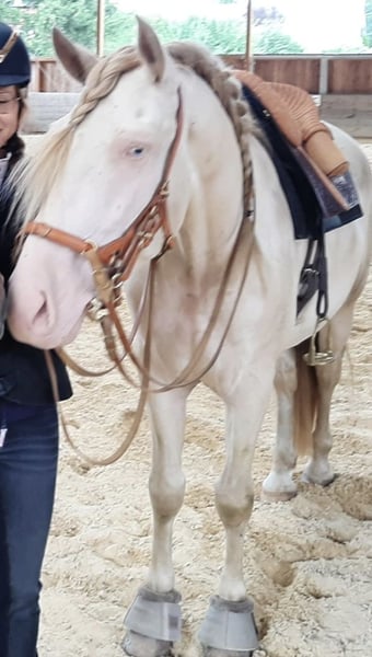 Nous vendons notre hongre PRE pure race. Fandango a un pelage brillant comme des perles au soleil. Sa longue crinière et sa queue légèrement ondulée lui confèrent beaucoup d’expression et de beauté. Ses yeux bleus clairs vous touchent droit au cœur. Ce joli hongre est né le 1er mai 2017 et mesure environ 1,60 m au garrot. En main, c’est un véritable « gentleman ». Fandango a été travaillé à pied, il connaît toutes les positions de conduite, et a également été utilisé en coaching. Il apprend rapidement les exercices de circonspection et adore se tenir sur le podium. Il s’approche de la marcheur, reste patient lors du monte et du descente. À cheval, il offre des allures confortables, faciles à monter. Fandango maîtrise les allures de base et a été monté en longues rênes. Lors de sorties en extérieur ou en trafic, il se montre un partenaire sûr. Fandango aime apprendre de nouvelles choses, et c’est un plaisir de continuer à évoluer avec lui. Ce hongre est ferré et débourré pour le loading, il voyage seul en van. Fandango a suivi une formation en coaching et thérapie assistés par le cheval. Fandango possède des papiers de l’ANCCE. Il hérite des meilleures qualités de ses ancêtres, les chevaux Cartujano, alliant élégance et volonté d’apprentissage. Nous vendons Fandango uniquement à contrecoeur, pour le meilleur foyer du monde. Il se trouve à 37574 Einbeck.