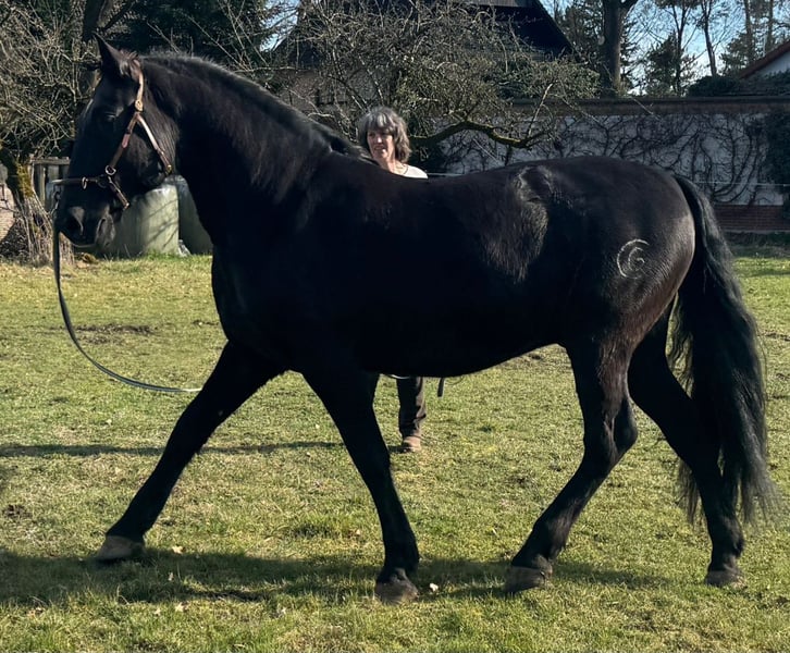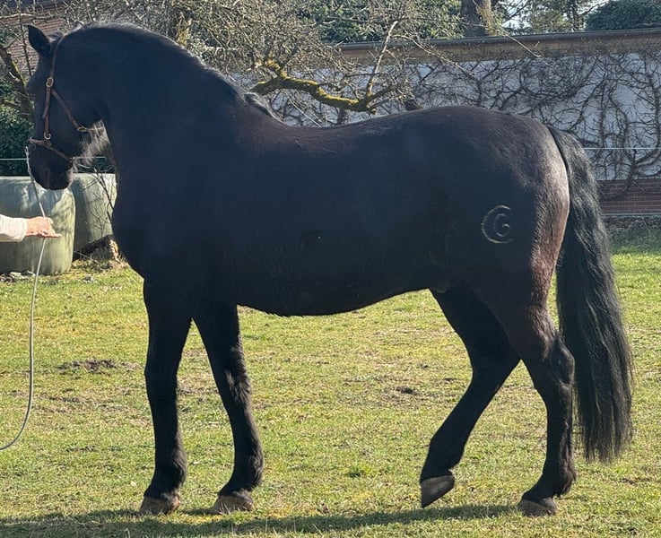 We are not looking to make a profit! Our main goal is to find a truly good home for this wonderful horse. Camaron (known as Schoki) has a striking presence, standing approximately 16.1 hh with a strong build. His appearance is simply breathtaking—like a shiny black pigskin in summer... even without grooming ;-). Riding him feels like sitting on a sofa. He is being trained in classical dressage, starting with a Baucher bit and a bosal. He is incredibly attentive and learns very quickly. He naturally masters the basic gaits, can perform the Spanish walk, lateral movements, and is beginning to Piaffe. Due to his Iberian-type intelligence, a confident rider who knows what they are doing is essential. But he is always gentle and cooperative. In his herd, he ranks high but is never overbearing. ... big mouth, no bite ... He has been with me since he was 4 years old. Now, at 8, he is still very unspoiled and currently not in training at all. Regrettably, I have to part with him for health reasons in his best interest, so he can be properly promoted according to his abilities. He can be viewed locally. However, to avoid riding tourism, he can only be tried under saddle by genuine interest, for a fee of €30. This is not an emergency sale. Inquiries from dealers are pointless. Price is negotiable for a good home!