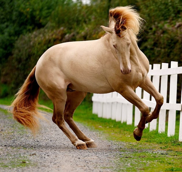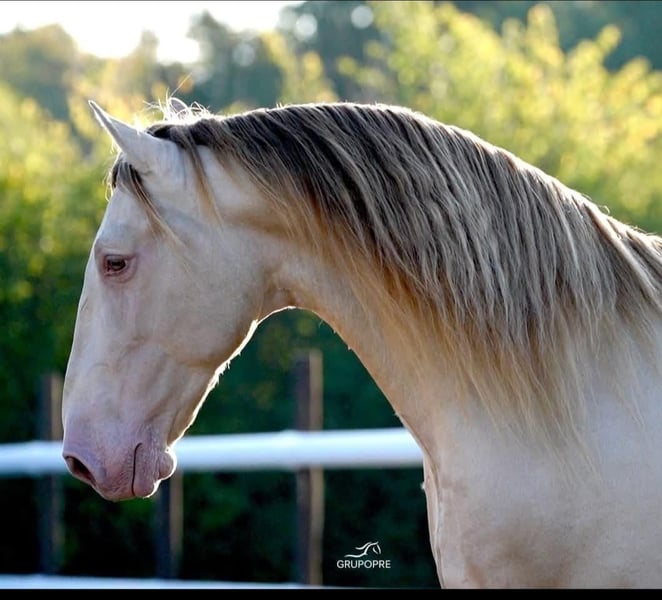 Stunning Purebred Spanish Horse (PRE) stallion standing at 16.1 hh, Flamenco LH stands out for his exceptional type, rare genetics, and remarkable temperament. Bred from high-quality bloodlines, he features a compact, harmonious, and very functional build, combined with supple, balanced, and expressive gaits, making him perfectly suited for dressage as well as breeding. Known for his gentleness and ease, Flamenco LH passes on an excellent mindset, good conformation, and a true presence to his offspring. ✨ Perlino coat (diluted genetics) – guaranteed color production ✨ Confirmed stallion with numerous progeny already on the ground ✨ Solid, balanced conformation ✨ Reliable character, very human-oriented 🔹 Fresh semen available across Europe (24/48 hours) 🔹 Experienced and professional service 🔹 Reproduction conditions available via contract Flamenco LH is an ideal choice for breeders seeking quality, temperament, and color, with a stallion already recognized for his successful progeny.