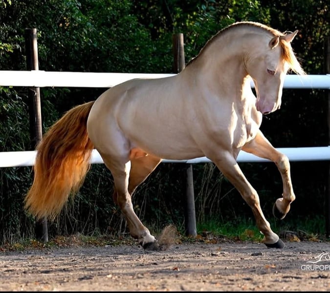 Hochwertiger PRE-Hengst (Pura Raza Española) mit 1,67 m Stockmaß, Flamenco LH besticht durch sein außergewöhnliches Exterieur, seine seltene Genetik und sein bemerkenswertes Temperament. Abstammend von edlen Linien, verfügt er über einen kompakten, harmonischen und sehr funktionalen Körperbau, kombiniert mit geschmeidigen, ausgeglichenen und ausdrucksstarken Gängen, die sowohl für das Dressurreiten als auch für die Zucht bestens geeignet sind. Für seine Freundlichkeit und seine leichte Handhabung bekannt, vererbt Flamenco LH an seine Nachkommen ein ausgezeichnetes Wesen, eine stabile Konstitution und eine echte Präsenz. ✨ Perlino-Farbe (dilutierte Genetik) – garantierte Farbzucht ✨ Bestätigter Hengst mit bereits zahlreichen Nachkommen ✨ Robustes, ausgeglichenes Modell ✨ Zuverlässiges, menschenbezogenes Wesen 🔹 Frisches Sperma in ganz Europa verfügbar (24/48 Stunden) 🔹 Erfahrung und zuverlässige Betreuung 🔹 Zuchtbedingungen nach Vertrag Flamenco LH ist die ideale Wahl für Züchter, die Qualität, Temperament und Farbe verbinden möchten, und bereits für seine Nachzucht anerkannt ist.