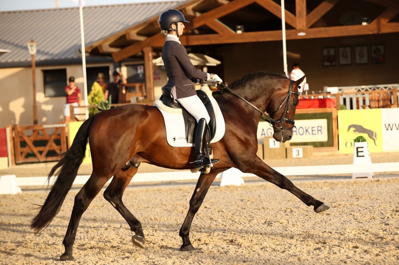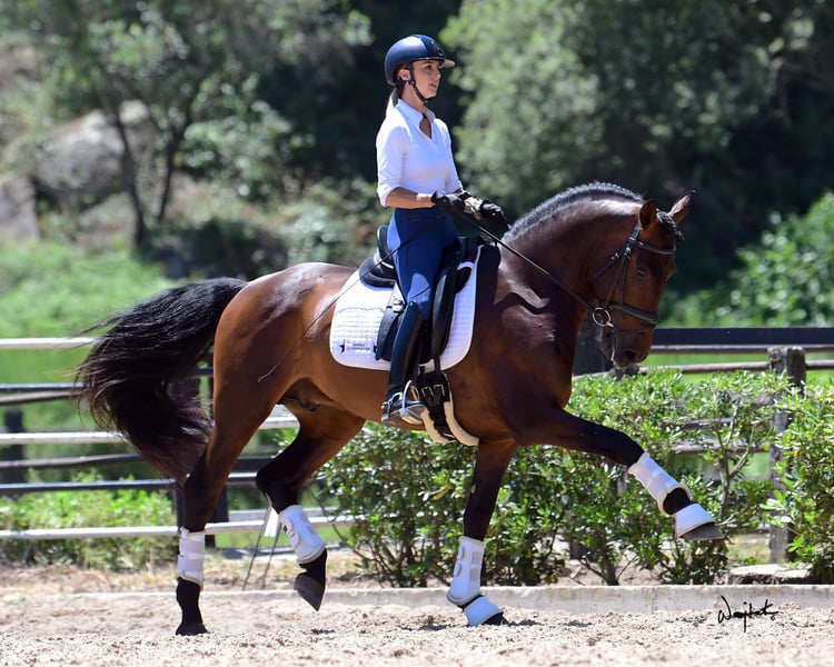 Destinado is a striking horse both in appearance and movement. His sire, Nazareno LXVIII, who belongs to our stable, was named JRR in Dressage and is a son of Utrerano VII, an Elite stallion of the breed. He possesses excellent natural gaits, performs well in exercises such as zig-zag half-pass and pirouettes, and is well-introduced to dressage exercises such as piaffe and passage, as you can see in the video. The flying changes are the only movement he finds challenging to execute. When he was younger, he competed in the 4- and 5-year-old categories, including at SICAB, consistently earning scores mostly above 70%, and even reaching scores over 78%. Destinado has a noble temperament, is always eager to work, and is very energetic. He has experience in outdoor rides and displays a very good character. Its reccomeneded for experienced riders who are looking to keep learning and enjoy the experience that this talented horse could give you.