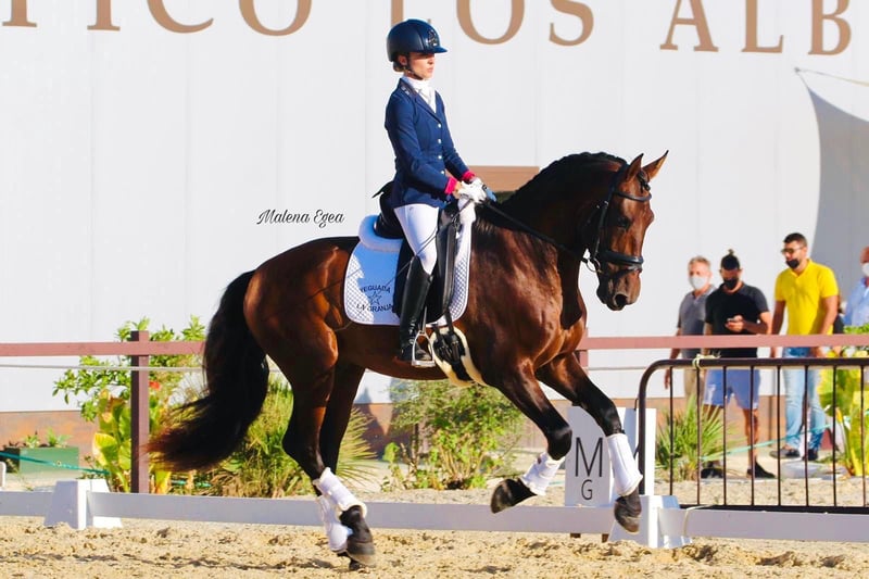 Destiné est un cheval remarquable tant par son apparence que par ses mouvements. Son père, Nazareno LXVIII, appartenant à notre élevage, a été nommé JRR de Dressage et est lui-même fils d’Utrerano VII, étalon d’élite de la race. Il possède de très bons allures, en plus de maîtriser des exercices de dressage tels que les appuyers ou les pirouettes, et d’être initié à des exercices comme le passage et le piaffer, comme on peut le voir sur la vidéo. Les changements de pied sont le seul exercice qui lui pose difficulté. Plus jeune, il a concouru dans les catégories de 4 et 5 ans, ayant participé à SICAB et obtenu lors de ses compétitions des notes majoritairement supérieures à 70 %, atteignant parfois plus de 78 %. Destiné est un cheval au caractère noble, toujours très volontaire au travail, tout en étant très énergique. Il a de l’expérience en balades en extérieur et montre un très bon tempérament. Ce cheval est recommandé aux cavaliers expérimentés qui souhaitent continuer à apprendre et profiter de l’expérience que ce talentueux cheval peut leur offrir.