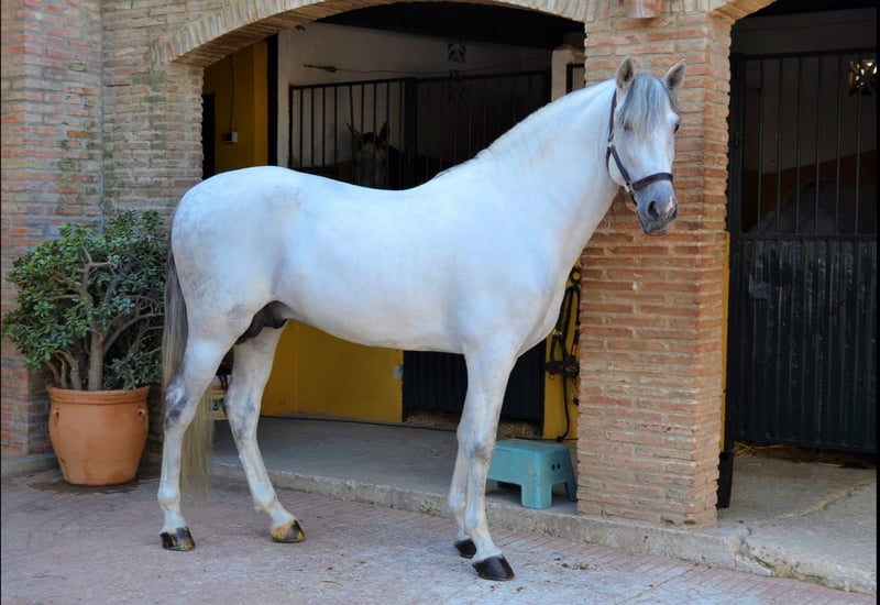 For sale is Yucateco, a snow-white PRE stallion from the old lines! The baroque Schönlig comes with a top pedigree with lots of blood from the old lines! Well-known names such as the top sires Armas Tortugo, Faraon and Lego are just some of them. Yucateco is ridden at elementary level, masters the lateral movements and starts with the piaffe! He has a very reliable character, knows ferias and is always reliable under saddle. This Spanish beauty comes from the very best stock, with full PRE papers and a current purchase examination with x-rays! Location: Spain - transport can be organised worldwide!