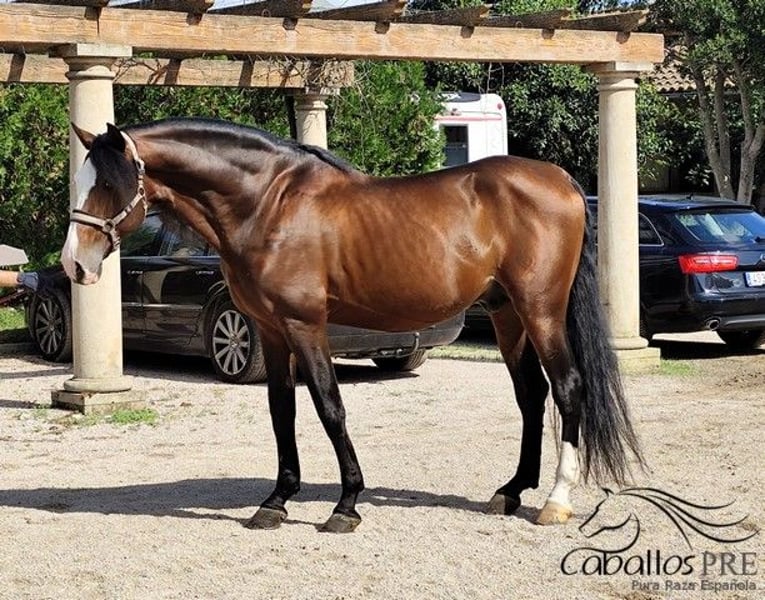 Gender: Stallion - Approved Born: 2012 Breed: P.R.E Color: Bay Height: approx. 1.68/69 m Father: Juglar XXVI Mother: upon request Training level: Ridden Price range: 5000.- - 10.000 Location: Spain Quiebro is a lovely, recreationally ridden approved P.R.E stallion with great size. He has three offspring and has otherwise only been ridden recreationally in the countryside. He could certainly be gelded upon request, but he showed no stallion behavior during our meeting. A great, stately P.R.E stallion who stands out immediately due to his distinctive, large blaze and is a real eye-catcher. He presented himself to me as very well-behaved, cool, and people-oriented. Due to his lineage, he is very interesting for breeding: paternally Juglar XXVI x Omni, maternally through Hacendoso XVIII - Poseido VII. If you would like more information about him, please contact us by phone. We are happy to send videos after a personal conversation. Anonymous inquiries will not be answered. Transport can be organized worldwide. Viewing is possible at any time by appointment.