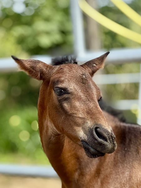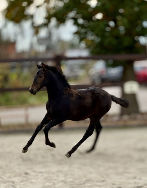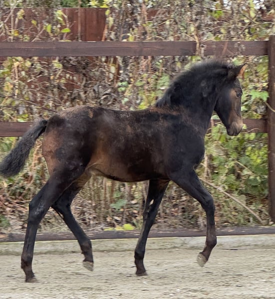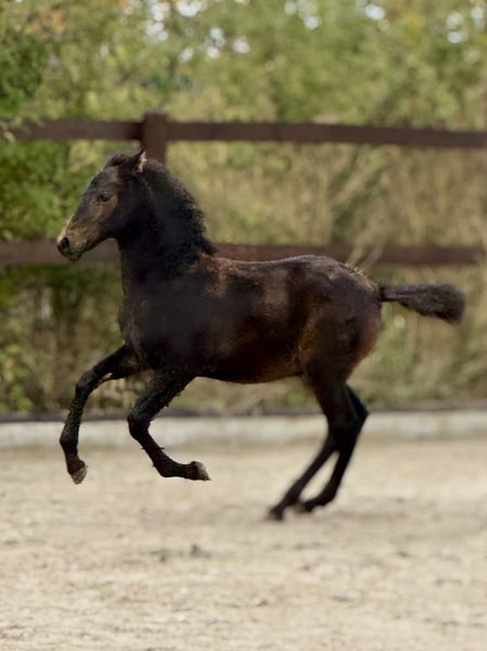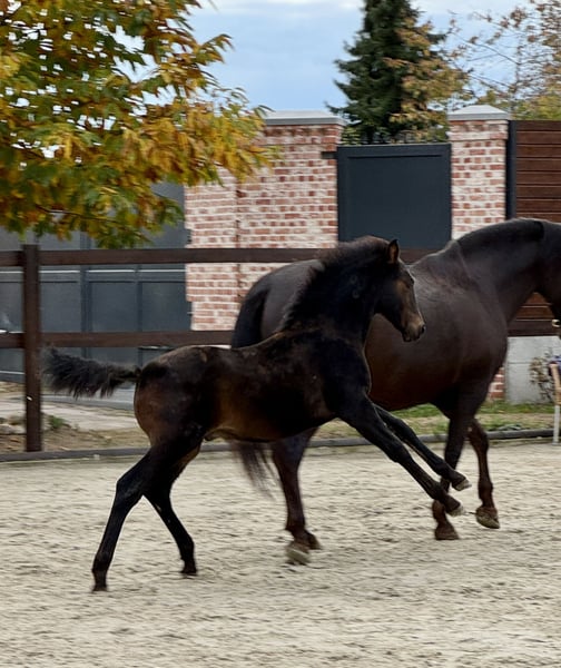 Quinteto, our eighth foal born this year, has arrived. He is a beautiful bay, now sporting a sleek dark bay coat for the autumn, with no markings at all. He has a very classic, noble head. His temperament is very relaxed and always friendly. He is very attentive to humans, curious in character but not intrusive. He has mastered the basics of foal handling, such as haltering, hoof handling, and leading a little. His movement, as expected from his excellent pedigree, is lively and noble. He displays a beautiful, rhythmical trot and a very elegant, well-balanced canter. His mother, Libelula, is a mare of the old, classical type, in a chocolate color—impressive, beautiful, and clever! His sire is the outstanding breeding stallion Crisonto GG, who is himself a progeny of the elite stallion Cacique. His movement has been proven to be outstanding! Quinteto is of a middle-ranking but has been completely trouble-free with all our foals since birth. It is worth seeing him; he will grow into a very good, reliable horse that will surely meet the expectations of even the most ambitious rider. For Quinteto, as for all our horses, our primary wish is to find a kind person with a sense of responsibility, who handles both the horse and themselves with care and patience. Our horses are completely unspoiled and have only had positive experiences.