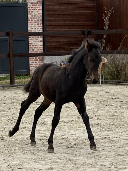 Quinteto, our eighth foal born this year, has arrived. Beautifully brown, now in autumn with a sleek dark brown foal coat and completely without markings. He has a very classic, noble face. His temperament is very relaxed and always friendly. He is very attentive to humans, curious in character but not intrusive. He has mastered the basics of foal handling, such as haltering, hoof handling, and leading a little. His movement, as expected from his excellent pedigree, is lively and elevated. He displays a beautiful, rhythmical trot and a very elegant, balanced canter. His mother, Libelula, is a mare of the old, classical type, in chocolate color—very impressive, beautiful, and intelligent! His father is the outstanding breeding stallion Crisonto GG, who is himself sired by the elite stallion Cacique. His movements are proven to be outstanding! Quinteto is of middle rank and has been running trouble-free with all our foals since birth. It is worth taking a look at him; he will become a very good, reliable horse that will surely meet the expectations of even the ambitious rider. For Quinteto, as for all our horses, we primarily wish for a kind person with a sense of responsibility who handles the horse with care and patience. Our horses are completely unspoiled and have only had positive experiences.