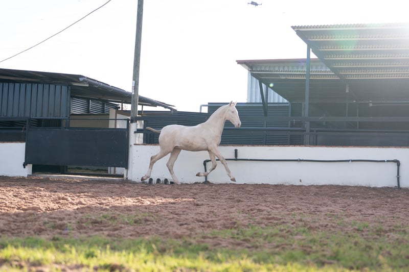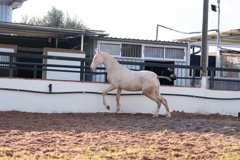 Große Gelegenheit, einen zukünftigen Spitzenhengst im P.R.E.-Typ zu erwerben: perlino, Careto und Cuatralbo – die exklusivsten Farbvarianten im Dilutionsbereich. Der Fohlen ist gerade 9 Monate alt, besitzt eine sehr gute Konstitution, ist kräftig und breit gebaut, mit guten Linien und korrektem Fundament. Seine Bewegungen sind äußerst ausdrucksstark und artistisch, was auf eine vielversprechende Zukunft in der hohen Schule und bei Shows hindeutet. Ebenso eignet er sich für die Arbeitssportart, als Zuchthengst oder zur Zucht, um eine eigene Herde aufzubauen. Er ist Nachkomme von Inedit II, einem cremello Hengst mit 1,73 m Stockmaß. Der Hengst steht in Castellón, nahe Valencia, Spanien.
