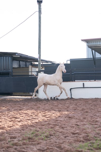 Gran oportunidad para adquirir un futuro gran semental P.R.E., perlino, careto y cuatralbo, lo más exclusivo en la capa diluida. El potro acaba de cumplir 9 meses, tiene muy buena estructura, fuerte y ancho, buenas regiones y aplomos. En cuanto a sus movimientos son muy expresivos y artísticos, se le puede intuir un gran futuro para la alta escuela y espectáculos, así como para equitación de trabajo y como semental y formar ganadería. Es hijo de Inedit II, semental cremello de 1,73m, se encuentra en Castellón, junto a Valencia en España