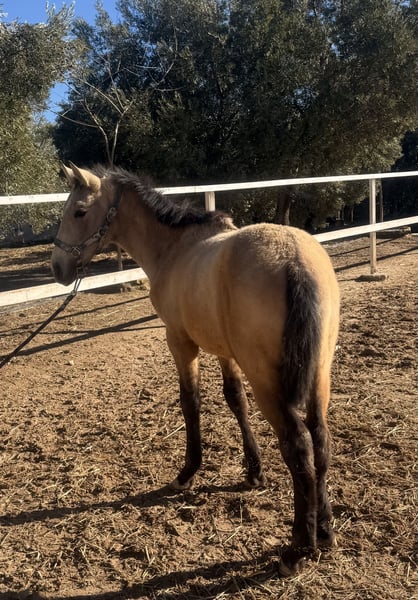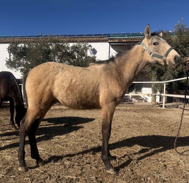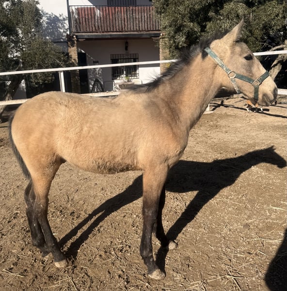 Enormous PRE foal with registration papers. Born in summer 2025. Sired by Norte A (PRE stallion with PERLINA coat color, genotype ggAAEeCrCr, son of FAROL PM and grandson of DIVO PM and CLAUDIO VIVES, 1.74 m, from Yeguada Antares) and out of Bienvenida (a torda mare of Bocado, sire Candau, 1.72 m, with genotype GgAAEeCCNN). Carries the Cr gene. Well-balanced conformation, good morphology, slightly convex head profile, noble and ramaleado. Raised in freedom, vaccinated and dewormed. Delivered with registration papers, coat color report, and vaccination certificates.