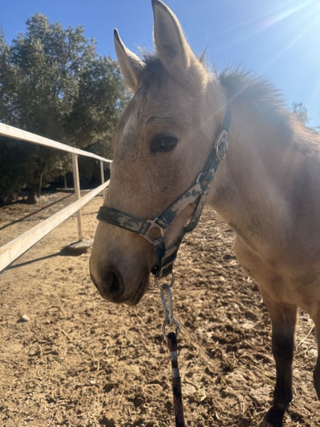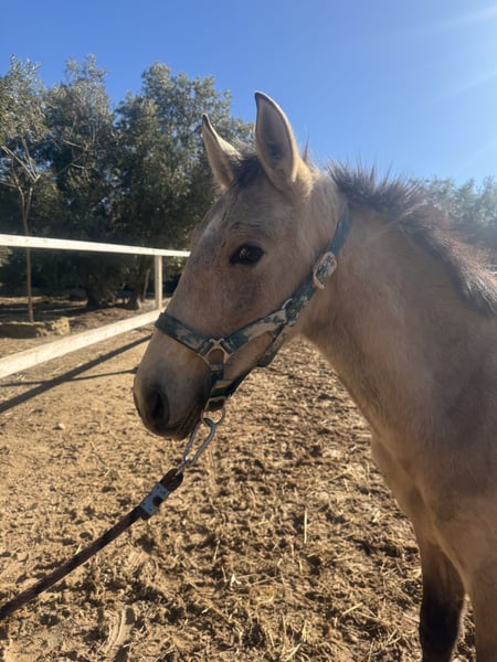 -Enorme potro PRE con carta. -De verano de 2025. -Hijo de Norte A (Semental PRE de capa PERLINA genotipo ggAAEeCrCr, hijo de FAROL PM y nieto de DIVO PM y CLAUDIO VIVES, 1,74m, de Yeguada Antares) y Bienvenida (madre torda del Bocado y padre Candau de 1,72 con genotipo GgAAEeCCNN). -Porta el gen Cr. -Bien aplomado, buena morfología, perfil de cabeza subconvexo, noble y ramaleado. -Criado en libertad, vacunado y desparasitado. -Se entrega con carta, informe de capa y sellos de vacunación.