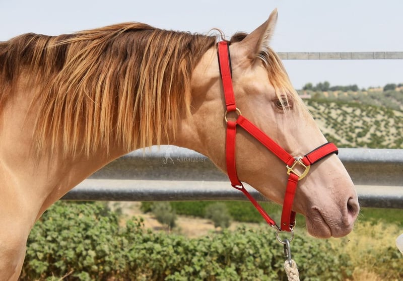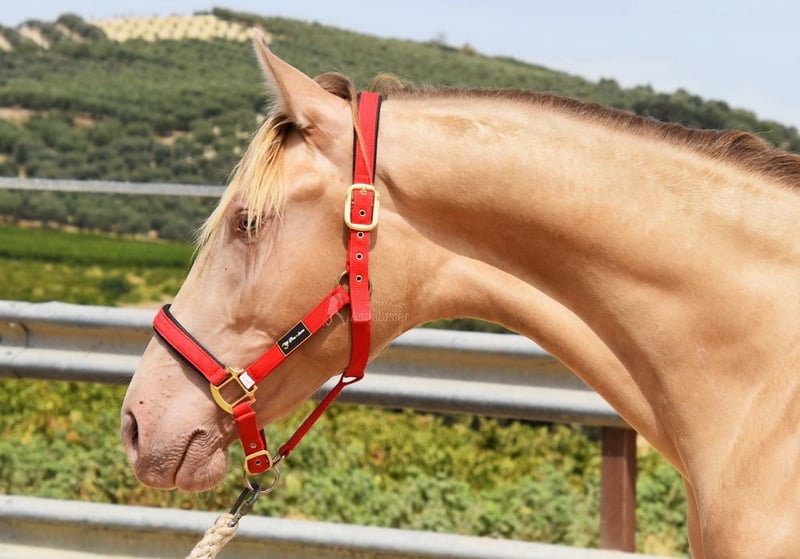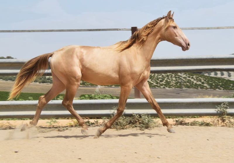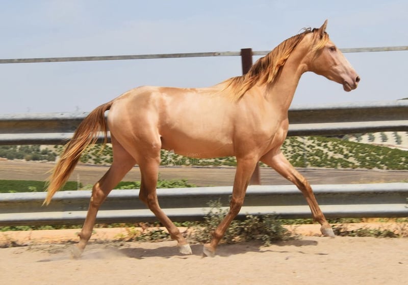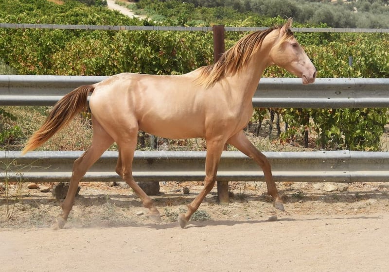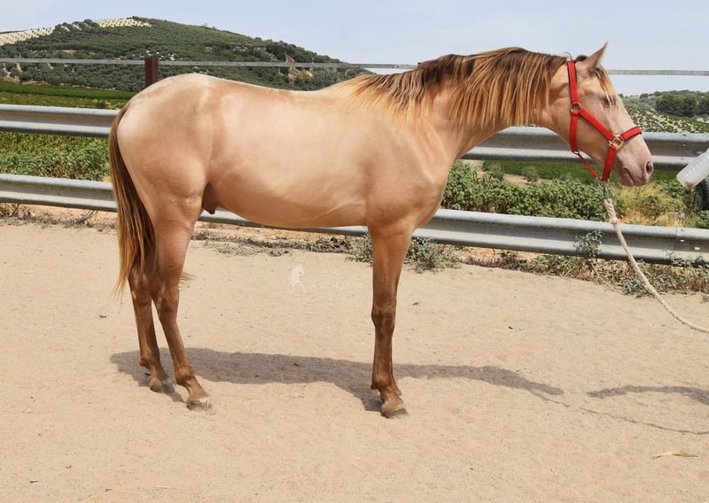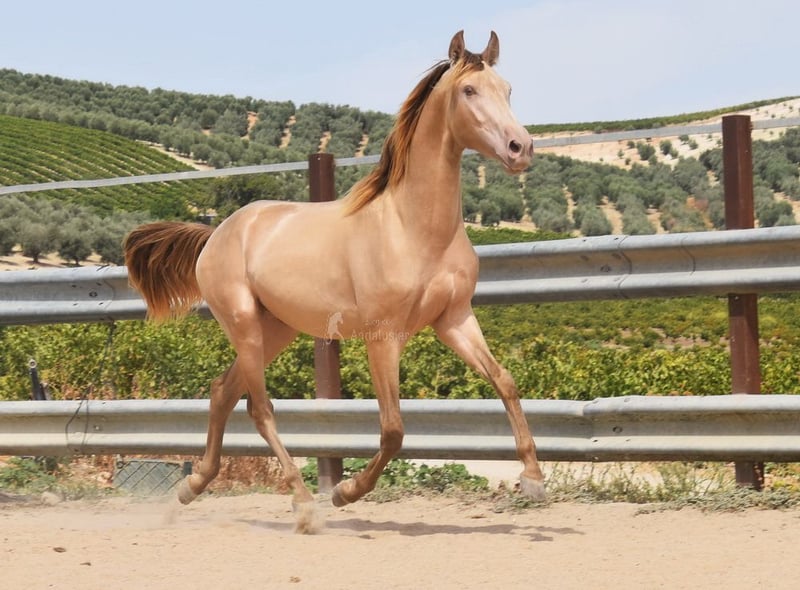 Spokojny charakter, ciekawski, surowy, stoi na zewnątrz z innymi młodymi ogierami, dobry ruch i rodowód, wyjątkowe umaszczenie, PRE Bayo Perla z papierami, rodowód: Antares, Paco Marti, Señorio de Bariain, Cardenas, Opa Karateka i Uropa Gaucho są kwalifikowane. www.elegante-andalusier.com