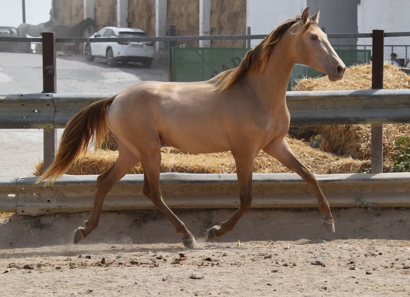 calm character, curious, raw, stands outside with other young stallions, good movements and pedigree, special color, PRE Bayo Perla with papers, pedigree: Antares, Paco Marti, Señorio de Bariain, Cardenas, Opa Karateka and Uropa Gaucho are qualified www.elegante-andalusier.com