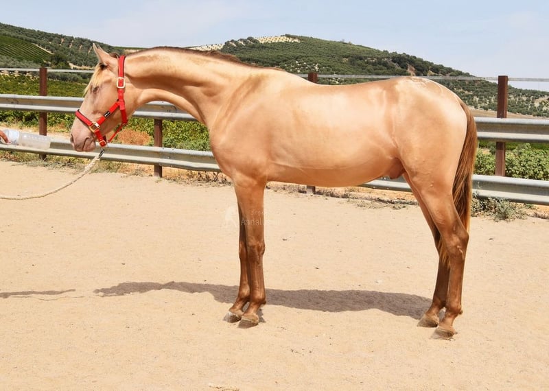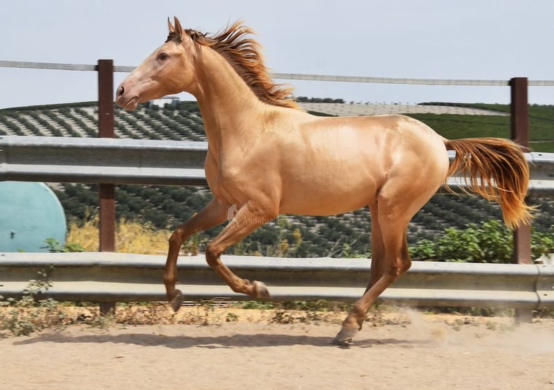 cher caractère calme, curieux, brut, est dehors avec d'autres jeunes étalons, bonnes allures et origines, robe spéciale, PRE Bayo Perla avec papiers, origines : Antares, Paco Marti, Señorio de Bariain, Cardenas, Opa Karateka et Uropa Gaucho sont qualifiés www.elegante-andalusier.com