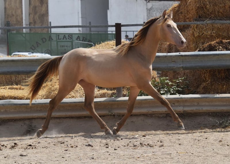 carácter tranquilo, curioso, sin domar, está afuera con otros potros jóvenes, grande, buen linaje, color especial, PRE Bayo Perla con papeles, linaje: Antares, Paco Marti, Señorio de Bariain, Cardenas, abuelo Karateka y bisabuelo Gaucho están calificados www.elegante-andalusier.com