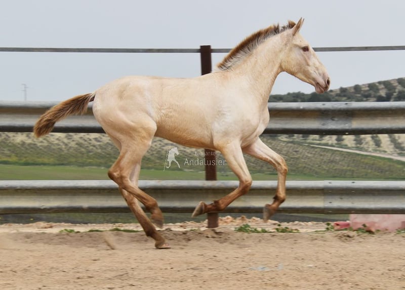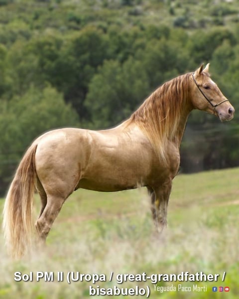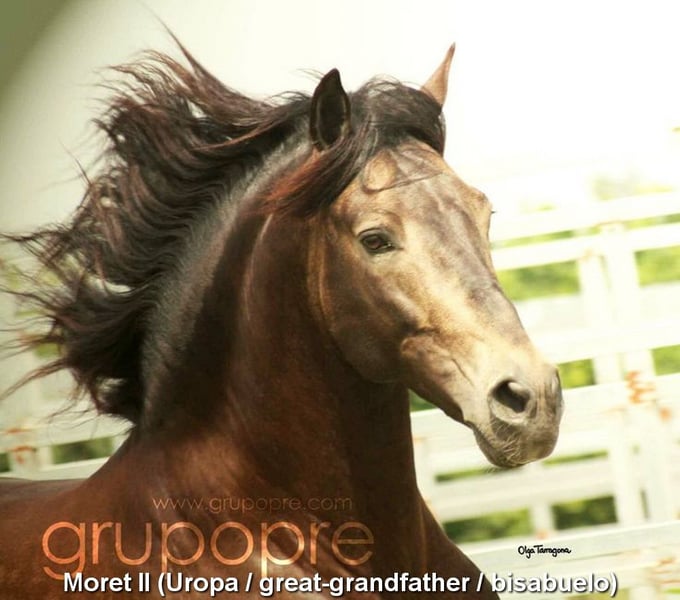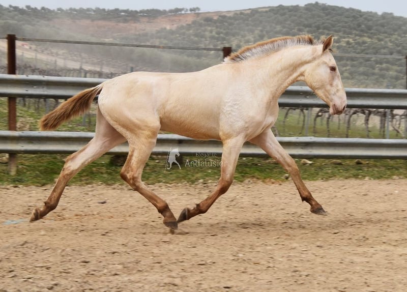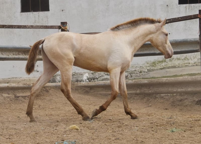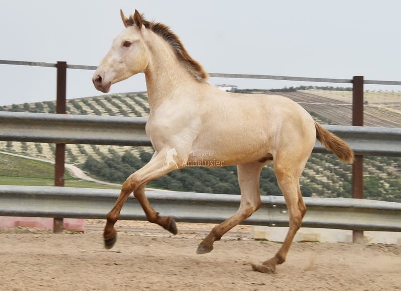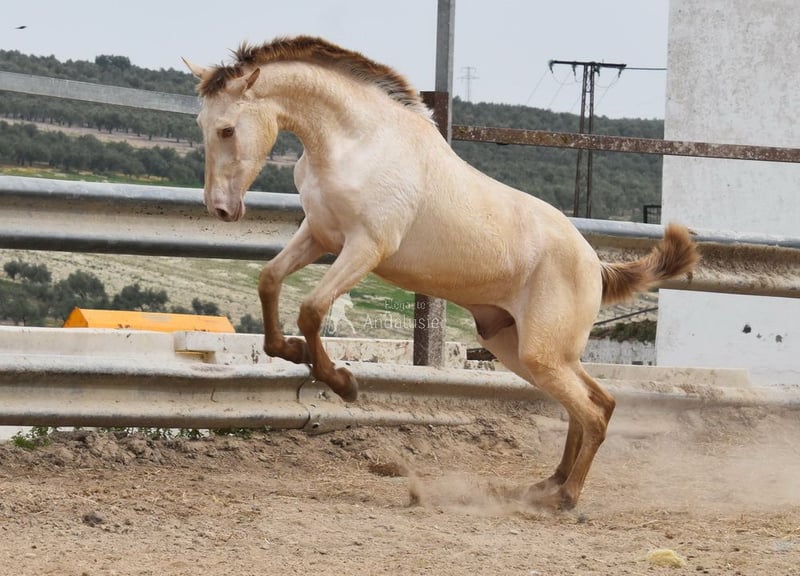 Gentle, calm temperament, curious, people-oriented, rough, outdoor with other young stallions, tall, baroque build, good movements, unique color, Bayo Perla with PRE registration, has good X-rays. Pedigree: Paco Marti, Escalera, Antares, La Aldara. www.elegante-andalusier.com