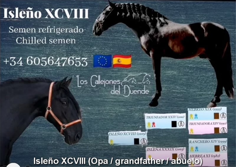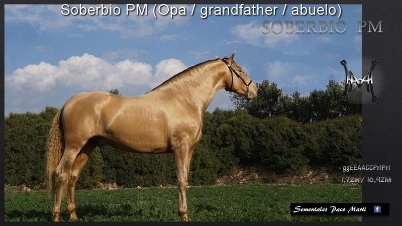 Carácter tranquilo y apacible, curioso y muy sociable con las personas. Es rústico, de tamaño grande, con un aspecto barroco y movimientos elegantes. Tiene un color especial, Bayo Perla, con papeles de PRE. Cuenta con buenas radiografías. Su linaje incluye a Paco Marti, Escalera, Antares y La Aldara. www.elegante-andalusier.com