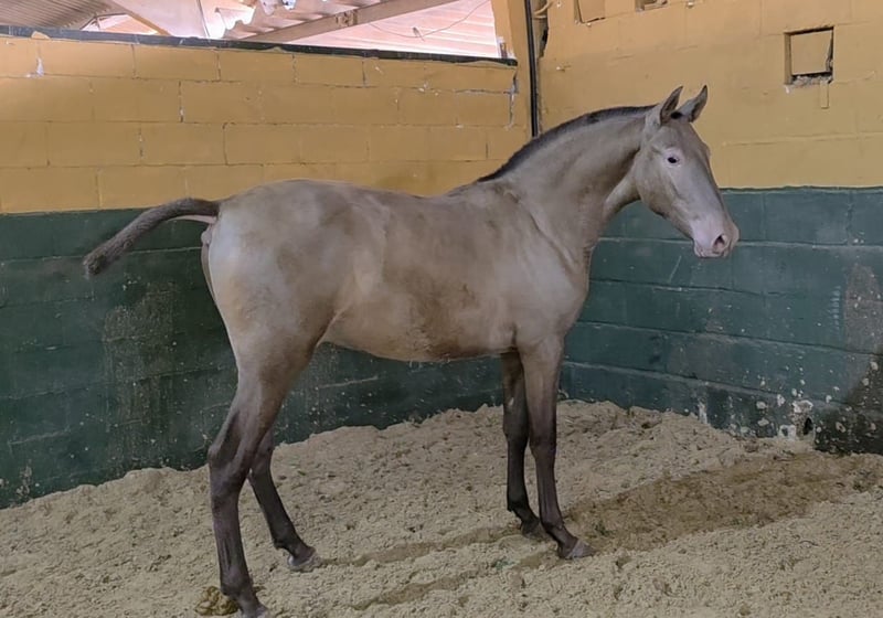 Jährling PRE-Hengst in goldschimmerndem Champagnerton. Er ist in der ANCCE registriert und verfügt über eine beeindruckende Pedigree (Ismaeli/Lastur; Impetuoso Gap II; Revoltoso XXIX), was ihn zu einem ausgezeichneten Zuchtpferd für verdünnte farbige PREs macht. Sein genetischer Fellfarben-Test ist auf Anfrage verfügbar. Da er das doppelte PRL-Gen besitzt, kann er Fohlen in Champagner- und Perlmuttfarben zeugen. Pirofrei! – Er kann in die USA, Kanada und Mexiko reisen.
