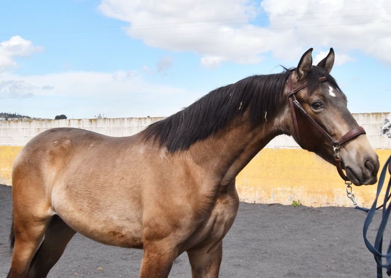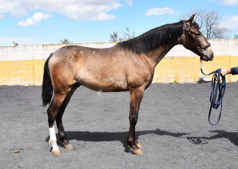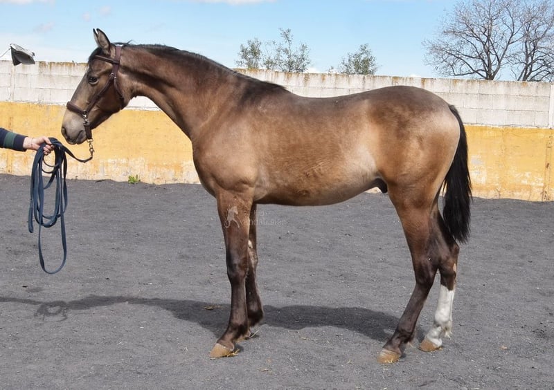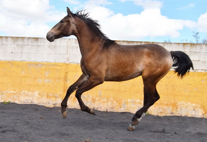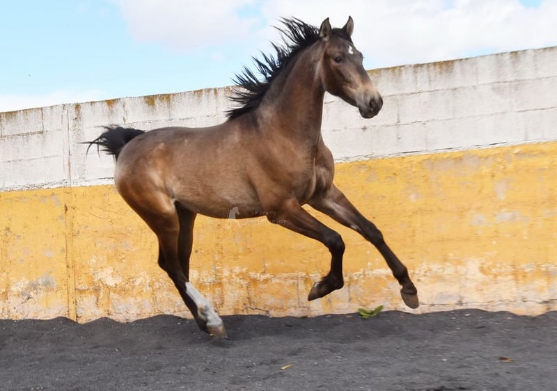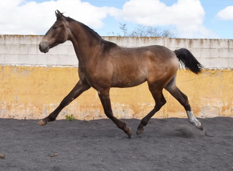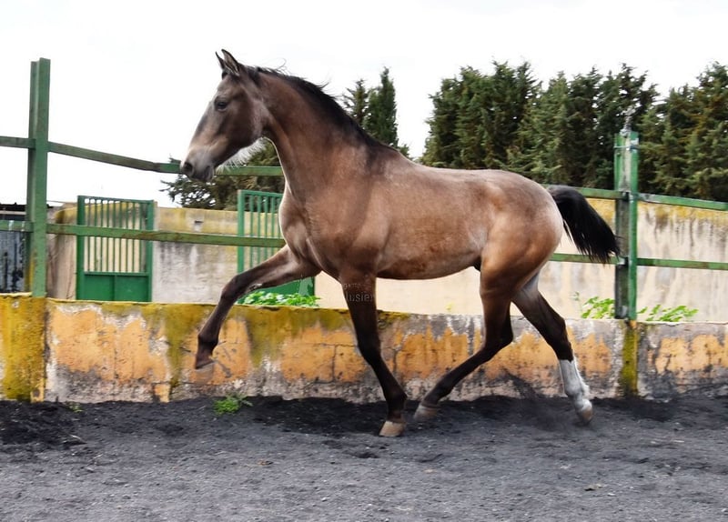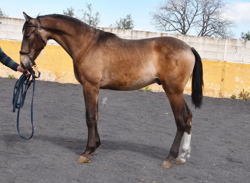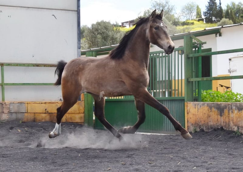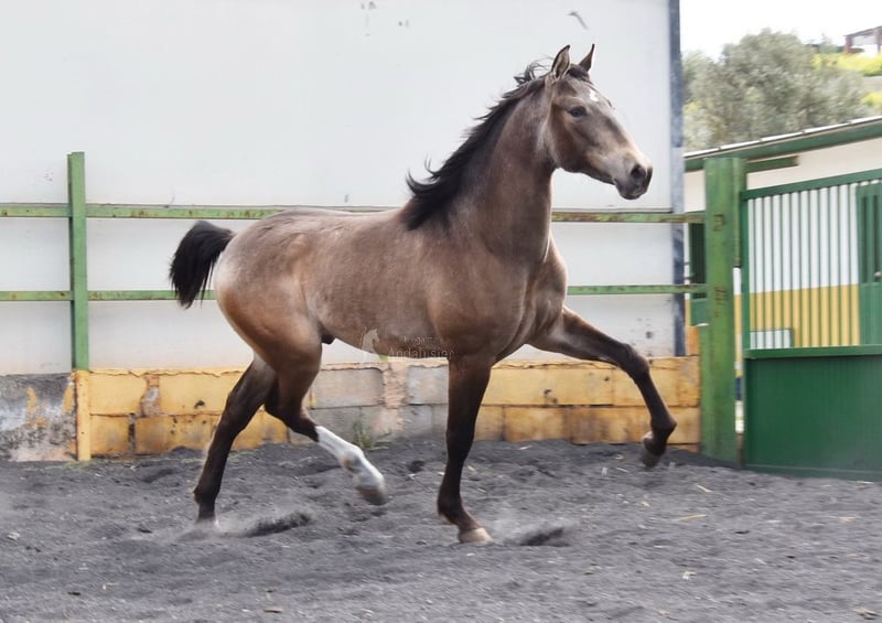 caractère gentil, brut, est dehors avec d'autres jeunes étalons, bonnes allures et origines, robe spéciale, fauve PRE avec papiers, origines : Alfredo Gala, Pablo Perez Jimenez, Miura, los Retamales, a plusieurs ancêtres qualifiés www.elegante-andalusier.com