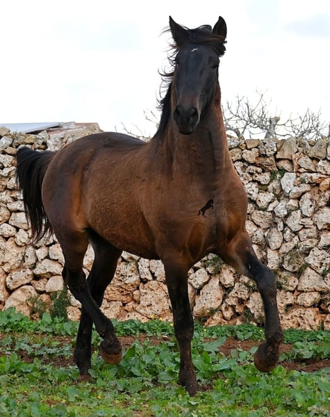 Deze hengst geboren in 2023 is een echte blikvanger. Hij straalt charme, esprit en expressie uit en is al zeer barok voor zijn leeftijd. Tegelijkertijd beweegt hij zich met een lichte zweefgang over de piste, waardoor je je nauwelijks kunt voorstellen hoe hij later in het dressuur- of showparcours zal presteren. Onder zijn dikke wintervacht is hij bijna zwart, met slechts een heel klein sterretje op zijn voorhoofd dat hij meestal verstopt onder zijn manen, en hij heeft een zeer subtiel wit afteken op een achterbeen. Zijn barokke exterieur is nu al indrukwekkend, en de jonge hengst weet dat hij er goed uitziet. Hij presenteert zich met trots en toont zijn beste bewegingen, ondanks de gladde ondergrond. In zijn afstamming vinden we veel Escalera-bloedlijnen en zelfs de Mejorante-hengst Dominante XVI. Het typische vuur, gecombineerd met de mensvriendelijkheid en zachte kracht van Escalera, is duidelijk zichtbaar in hem. De fokker hecht grote waarde aan dat hengsten minimaal tot hun derde levensjaar opgroeien in een hengstenhengstengroep. Zo heeft hij tijdens de regenseizoen op Menorca een dikke wintervacht en wat manen in zijn vacht, wat slechts een indicatie is van zijn natuurlijke opgroei. :) Met een huidige schofthoogte van ongeveer 159 cm zal hij nog groeien tot circa 165 cm, waardoor hij voor veel disciplines interessant wordt. Hij is barok, maar zeker niet zwaar of log. Het is mogelijk dat hij ter plaatse nog verder wordt getraind en voorbereid op het leven als rijpaard. Voor degenen die geen hengst kunnen houden, bestaat uiteraard ook de optie tot castratie ter plaatse. Zijn locatie is Menorca. Video’s en afstamming op aanvraag beschikbaar. Graag organiseer ik ter plaatse een keuring, training, castratie, transport of zelfs uw reis, mocht u hem persoonlijk willen komen bekijken. Details hierover vindt u op mijn website of in een gesprek. Groeten uit Spanje