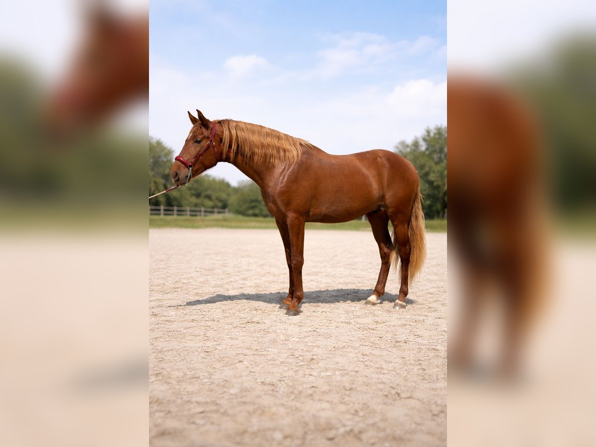 3-Year-Old Chestnut Stallion This attractive 3-year-old chestnut stallion impresses with his balanced conformation, expressive movement, and friendly character. He presents himself with a natural elegance and shows promising potential for further training in various disciplines. The stallion is well-handled for his age, displays a willing attitude, and is eager to learn. His correct gaits and active hindquarters make him an interesting prospect for sport or leisure riding. With his charming presence and good temperament, he is suitable for riders looking for a young horse to develop further. A great opportunity to acquire a quality youngster with a bright future ahead.