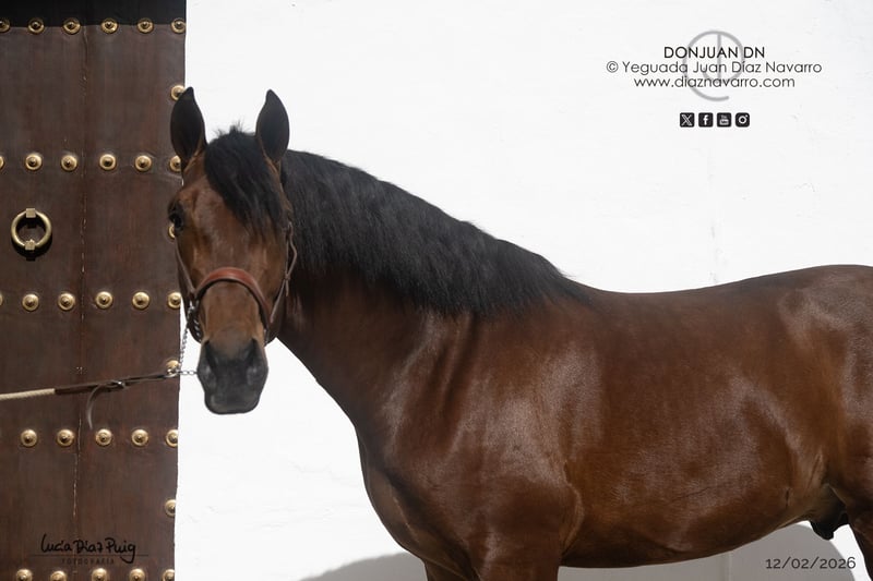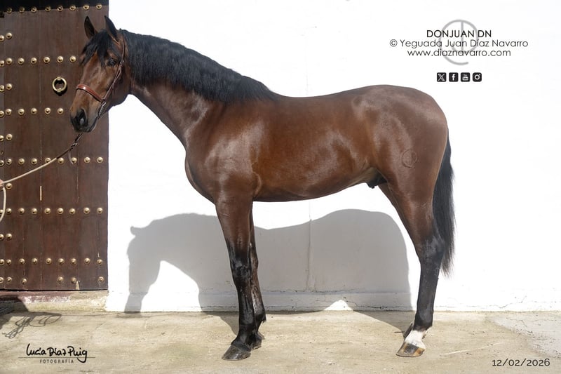 Semental de 2023, Castaño, 175 cm de altura https://diaznavarro.es/donjuan-dn Presentamos un impresionante semental nacido en 2023, con una estatura de 175 cm y un hermoso pelaje castaño. Este joven caballo muestra un potencial excepcional para el trabajo en doma clásica y otras disciplinas ecuestres. Su estructura sólida y su presencia noble reflejan una genética prometedora, ideal para caballeros y criadores que buscan un futuro estrella en el mundo ecuestre. Con un carácter equilibrado y una buena disposición para el entrenamiento, este semental ha sido bien manejado y está acostumbrado a la vida en el establo y a la interacción con personas. Su línea, combinada con su físico destacado, lo convierten en una opción muy interesante para quienes desean invertir en un caballo con gran proyección. No dudes en contactarnos para más información o para concertar una visita y conocer de cerca a este prometedor ejemplar.