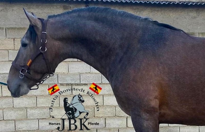 Der barocker PRE Hengst Marques überzeugt auf ganzer Linie nicht nur mit seinem Exterieur und expressivem Gangwerk, sondern auch mit seinem goldenen Charakter. Seine Blutlinie ist sehr ergiebig. In der Vaterlinie finden wir viele Yeguada Miitar Exemplare, welche auf eine super Funktionalität hinweisen. In der Mutterline hat er einige tolle Cartujano vorzuweisen aus der Terry Zucht, z.B. Hoscon III und Gorron II. . Geboren wurde er am 20.05.2022. Marquez befindet sich im anlongiertem Zustand. Derzeit ist er 1, 62 m gross.