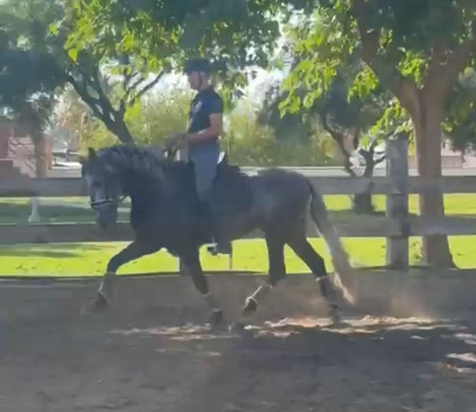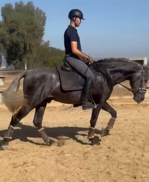 Wunderschöner junger PRE mit vielversprechenden Bewegungen für die höheren Dressuraufgaben. Er besitzt sehr gute Manieren und zeigte beim Anreiten keinerlei schlechtes Verhalten. Er ist äußerst sanft und mutig. Er kennt Ausritte im Gelände und ist offen für Neues, wobei er stets mutig bleibt.