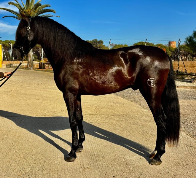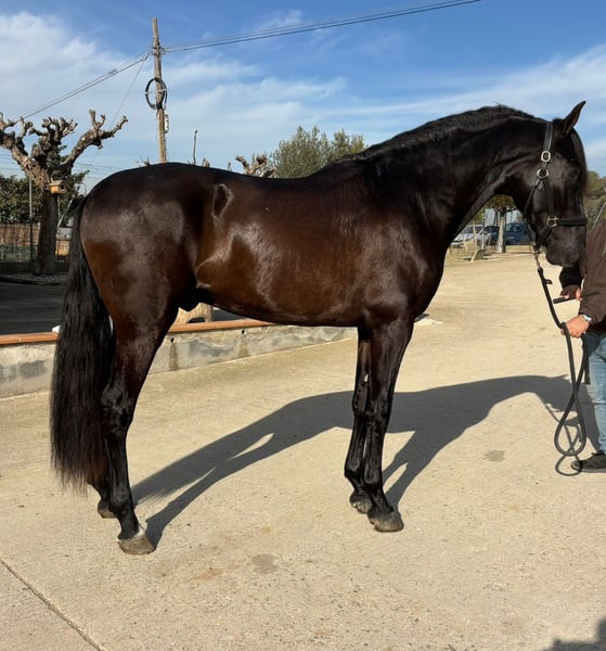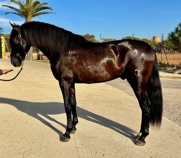 Dieser beeindruckende PRE-Rappe – ein wahrer spanischer Black Beauty – ist auf der Suche nach seinem ganz persönlichen Herzensmenschen. Mit seiner tiefschwarzen Farbe, seiner stolzen Erscheinung und seinen schwungvollen, harmonischen Gängen zieht er die Aufmerksamkeit ganz selbstverständlich auf sich. Wo immer er auftaucht, verzaubert er sein Umfeld. Auch charakterlich weiß er zu begeistern: Er zeigt sich äußerst lieb, respektvoll und fein im Umgang, dabei sehr menschenbezogen und interessiert an allem, was um ihn herum geschieht. In diesem Frühjahr wird er 4 Jahre alt. Aktuell misst er ca. 1,65 m, seine Endgröße schätzen wir auf etwa 1,67–1,68 m. Frisch aus seiner Junghengstherde kommend, bringt er bereits eine sehr gute Basis mit. Das Fohlen-ABC beherrscht er ebenso wie das Führen und Longieren, was er brav und gelassen mitmacht. Momentan wird er behutsam auf das Anreiten vorbereitet. Aufgrund seiner Qualität, seines Wesens und seiner Bewegungen sehen wir ihn vielseitig einsetzbar – sei es in der Dressur, der Working Equitation, im Showbereich, in der Zucht oder als zuverlässigen Freizeitpartner. Er wuchs in einer großen Herde mit Stuten und Fohlen auf der Weide auf und durfte mit etwa 8 Monaten in einer Junghengstherde weiter aufwachsen. Dort konnte er sich sozial bestens entwickeln. Inzwischen ist er eingestallt und kennt die Boxhaltung ebenfalls problemlos. Aktuelle Röntgenbilder liegen vor und sind ohne Befund. Auf Wunsch kann er direkt bei uns kastriert werden und als Wallach in sein neues Zuhause ziehen. Ebenso besteht die Möglichkeit, dass er noch einige Monate bei uns bleibt, um schonend angeritten zu werden. Während dieser Zeit kann er selbstverständlich jederzeit besucht werden. 📍 Standort: Barcelona, Spanien Ein Kennenlernen vor Ort ist jederzeit möglich, der Transport kann problemlos organisiert werden.