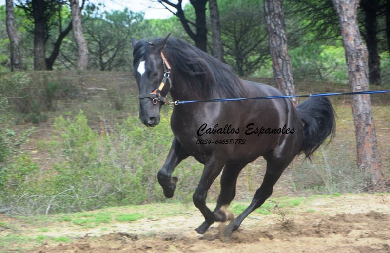 Ce mâle PRE de grande taille est construit de manière correcte et harmonieuse. Une étoile blanche apparaît toujours sous son petit nez. En manège, il est très gentil. Lors de notre sortie de box, il est passé sans problème à côté d'une jument en longeant. Le mâle est très proche de l’homme et aime beaucoup qu’on le caresse. Il est toujours attentif et écoute bien. Il est en longe et connaît la selle. Il reste très détendu dans ces conditions. Ce jeune cheval possède trois allures de base très bonnes. Il a un pas particulièrement excellent et un galop très équilibré, avec beaucoup de impulsion vers le haut. Un cheval idéal pour la dressage et la Working Equitation. Ce cheval est vendu pour le compte de son propriétaire. Il peut rester en pension chez nous si souhaité. Une échographie est organisée rapidement. Transport international possible.