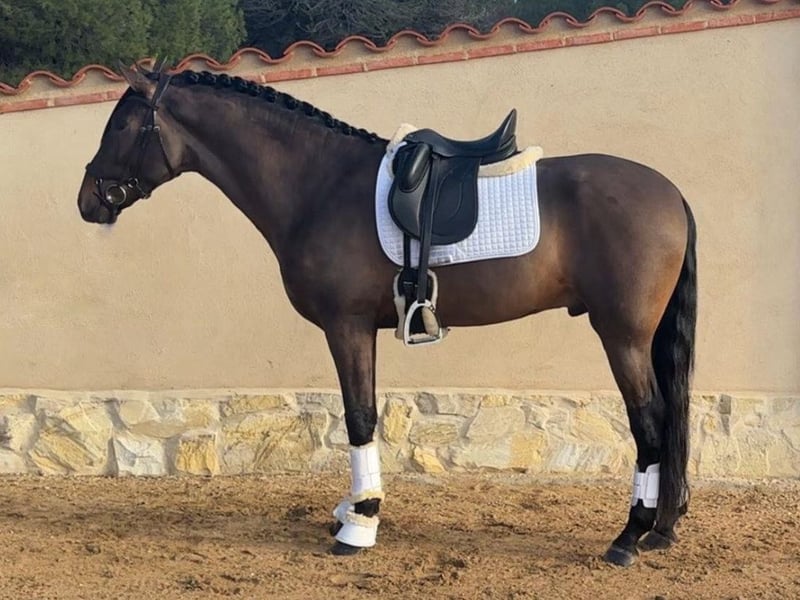 Wir präsentieren ein Pferd der Rasse Pura Raza Española (PRE), geboren im Jahr 2022, mit einem Stockmaß von 168 cm, das eine sehr attraktive Kombination für den heutigen Markt vereint: Jugend, hochwertige Grundgangarten, hervorragenden Charakter und solide tierärztliche Garantien. Dieser braune Hengst überzeugt durch eine elegante und harmonische Erscheinung und zeigt seine Qualität sowohl im täglichen Umgang als auch unter dem Reiter. Derzeit ist er auf Basisniveau geritten und verfügt über eine korrekte und solide Grundausbildung, mit einer sehr positiven Arbeitseinstellung. Er ist kooperativ, ausbalanciert und lernwillig, was seine zukünftige Entwicklung in der klassischen Dressur deutlich erleichtert. Sein Charakter ist eine seiner größten Stärken: edel, ruhig und unkompliziert, sowohl an der Hand als auch unter dem Sattel, ideal für ein progressives und stressfreies Trainingsprogramm. In der Bewegung zeigt er drei hochwertige Grundgangarten, wobei besonders der Schritt hervorzuheben ist: raumgreifend, taktrein und ausdrucksstark, einer der am meisten geschätzten Gangarten in der Dressur. Der Trab ist elastisch mit guter Mechanik, und der Galopp ist bequem, ausbalanciert und mit entsprechender Arbeit leicht zu versammeln. Aus tierärztlicher Sicht bietet das Pferd maximale Sicherheit: Es ist piroplasmose negativ und verfügt über sehr gute Röntgenbilder, die zur Verfügung stehen und zusätzliche Sicherheit sowohl für den Sport als auch für seine Zukunft als Zuchthengst bieten. Insgesamt handelt es sich um eine hervorragende Gelegenheit für alle, die einen jungen PRE mit sportlicher Perspektive, zuverlässigem Charakter und solider tierärztlicher Basis suchen – geeignet sowohl für die klassische Dressur als auch als zukünftiger qualitätsvoller Zuchthengst.