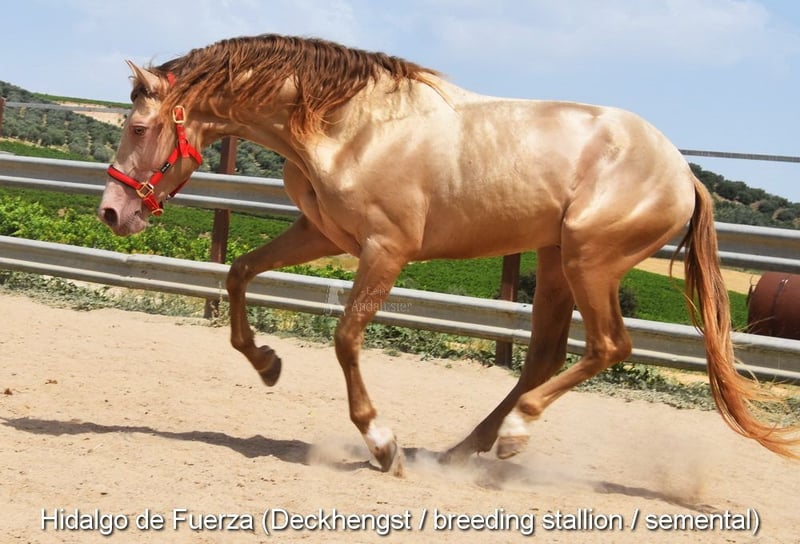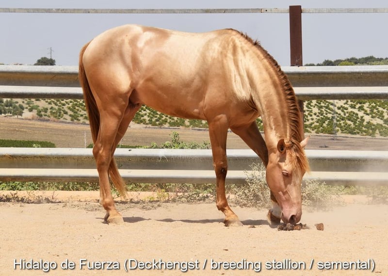 caractère doux, curieux, attaché aux humains, longé, commence à être monté, bonnes allures, couleur spéciale, pleine du étalon PRE Bayo Perla Hidalgo de Fuerza, le poulain est attendu pour août 2026, pedigree : Hnos Gonzalez Gallego, Francisco Diaz Gonzalez, Yeguada Militar, Yeguada el Bayo www.elegante-andalusier.com