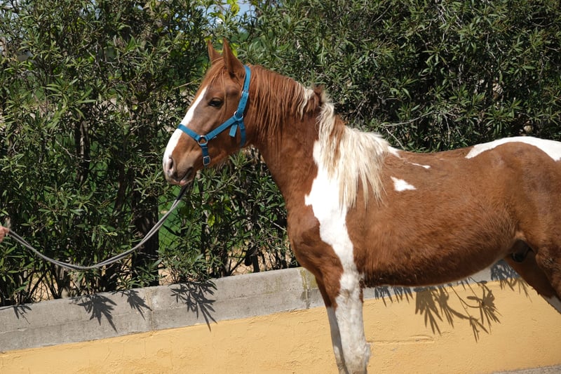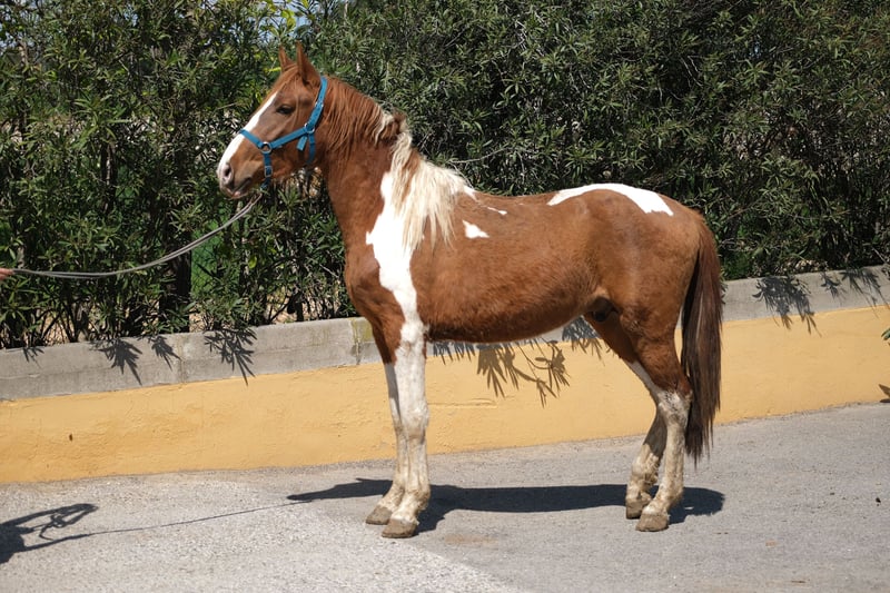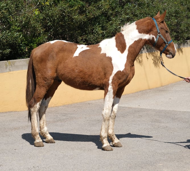 Il nostro bel puledro è un giovane stallone di 4 anni, conosce l'ABC dei puledri e attualmente vive in una box con paddock accanto ad altri cavalli. È un incrocio tra un PRE e una fattrice andalusa, con anche del Quarter Horse, e possiede un passaporto equino. Ha un aspetto molto particolare come un pinto con la sua figura barocca e un'ottima presenza. La sua altezza finale da stallone adulto è stimata intorno ai 1,60 m. Ha un carattere molto vivace, curioso e socievole, quindi gli piace essere coinvolto in tutto e ama le lunghe sessioni di coccole. Vuole essere parte di ogni attività e esplora tutto con grande attenzione. È un burlone con cui è davvero divertente trascorrere del tempo. Conosce già i cani e non si lascia intimidire da loro. Sta crescendo per diventare uno stallone davvero eccezionale e coraggioso, con potenzialità in diverse direzioni, sia nella dressage, nella working equitation, nelle esibizioni o semplicemente come compagno per il tempo libero. Conosce già l'ABC dei puledri e sa essere lungato, ma non è ancora stato montato, quindi è perfetto per qualcuno che desidera addestrare il proprio cavallo da solo e non vuole iniziare troppo presto; infatti, la maggior parte dei cavalli in Spagna viene montata già a 3 anni, quindi con questo bel cavallo si ha la fortuna di avere un spagnolo di 4 anni che non è ancora stato montato. Attualmente vive con la sua allevatrice, che alleva i suoi cavalli con tanto amore e pazienza, affinché si sviluppino in animali equilibrati e aperti. Per lui desideriamo una persona che voglia crescere insieme a lui come un team e continuare la sua educazione, affinché possa diventare un ottimo stallone o un castrato. È possibile effettuare una castrazione in loco, se necessario. Posizione: Barcellona, Spagna, un incontro in Spagna e il trasporto possono essere facilmente organizzati.