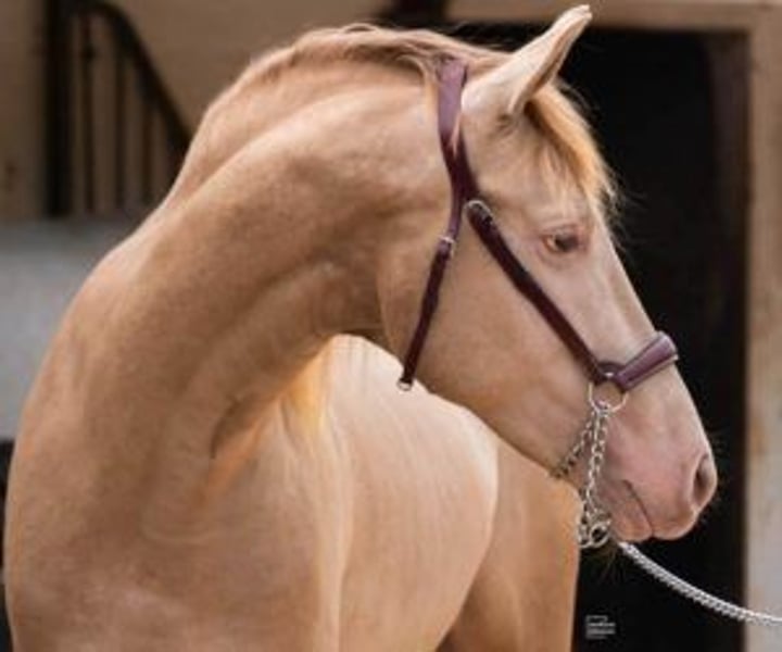 Future stallion and extraordinary life companion This young 4-year-old stallion grew up in freedom, in an environment that allowed him to develop peacefully. While many foals begin ridden at 3 years old, his owner preferred to give him an extra year to properly train. He is now at the ideal time to begin work. Now that he's ready to take his first steps under saddle, seeing him in front of you confirms that the wait was worth it. It's not just his coat Isabella— rare and highly sought after at PRE — which attracts attention, but also its attitude: a calm young horse, with a frank gaze, who readily accepts proximity and contact. From the very first moment, he exudes a serenity that makes you want to work with him. He lets himself be caught without difficulty, remains calm when tied up, gives his feet with confidence and lets himself be touched everywhere. For a stallion who has not yet started breaking in, he shows remarkable assuranceHe doesn't get agitated, doesn't get ahead of things: he waits, listens and responds. And at that age, that's already very telling. When he moves, he's a pleasure to watch. He has a broad, supple trot, a steady walk, and a well-balanced canter. With these qualities, he'll be able to progress in both dressage and working disciplines. He feels natural, with good aptitude for whatever you ask of him. And if you're interested in reproduction, here's an added bonus: he is a carrier of the gene Cr, which guarantees that he will systematically transmit diluted coats to his foals (palominos, golden bays, creams, isabelles, etc.). This is a great opportunity for anyone looking to acquire a different horse, with real added value. Its genetics will allow you to breed foals that are highly sought after on the market, while enjoying a daily companion with a strong character and a beautiful presence. An investment that is lived to the fullest... and which can also generate a good return thanks to the coverings, because its profile is highly sought after by breeders of PRE with diluted coats. At IberHorse, we select horses according to the same criteria we would use for ourselves: character, quality and ease of work. If this young Isabelo matches what you are looking for, we will be happy to tell you more and arrange a visit.