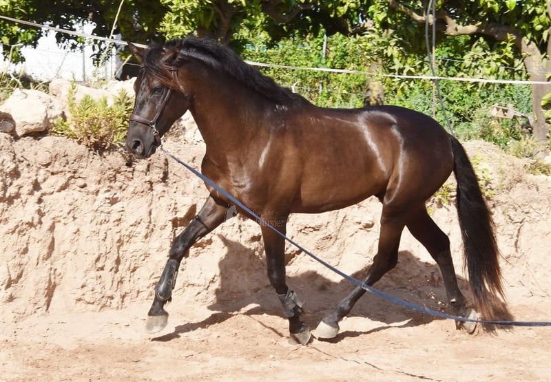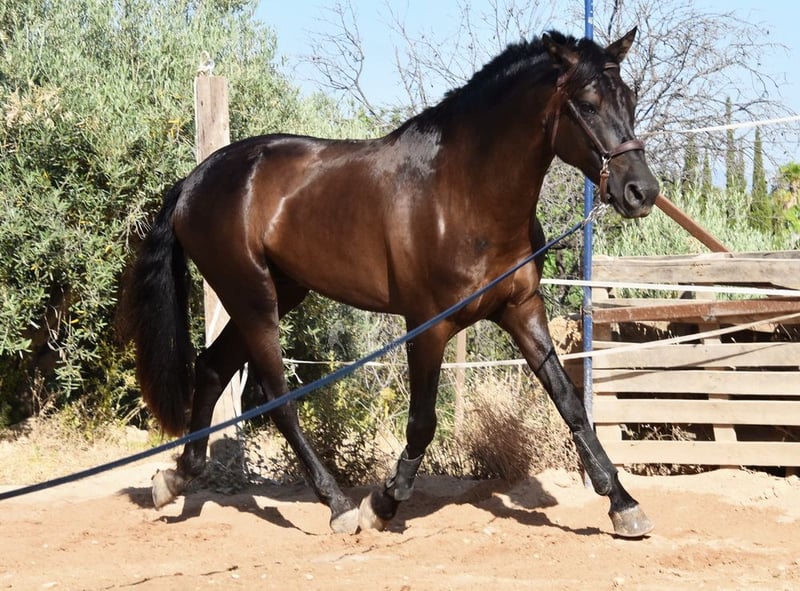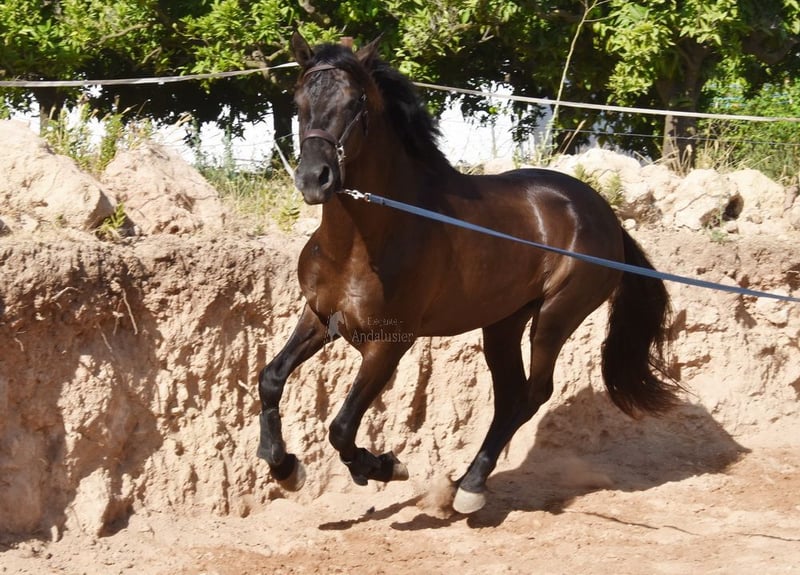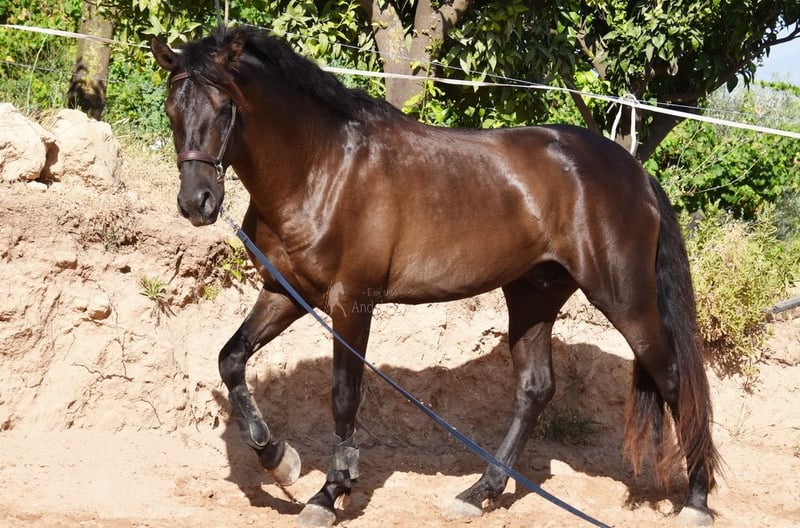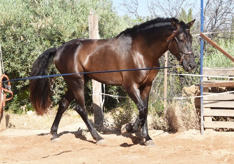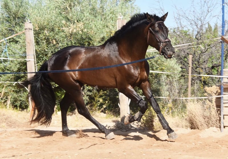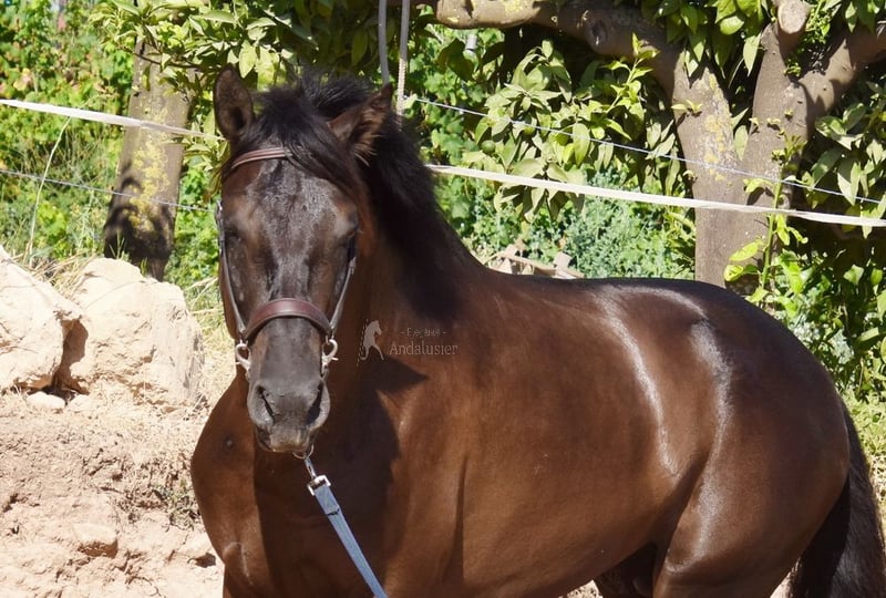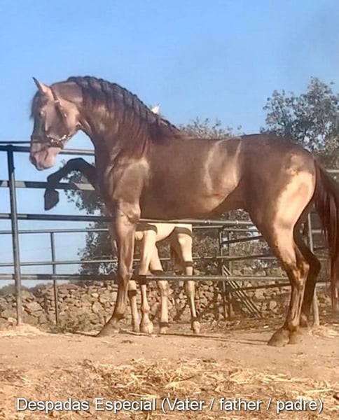 carattere gentile e tranquillo, curioso, affettuoso, montato nelle andature di base e nel terreno, buone movenze, baio con gene PRL, discendenza: Yeguada las Espadas, Yeguada los Valcanos, Ururopa Laborioso III è qualificato www.elegante-andalusier.com
