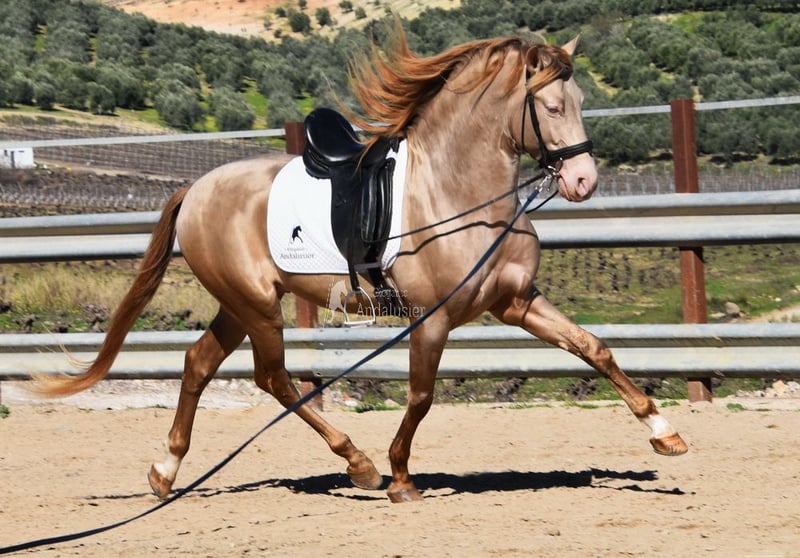Caractère doux, calme, curieux, joueur et affectueux. Monté en allures de base, adapté à la randonnée. Grand, de style baroque, confortable. Cheval de reproduction, étalon, couleur spéciale. Baya Perla (CrPrl) avec papiers PRE. Radiographies bonnes, Piro négatif. Origines : Antonio Guiral Guarga, Castillo Villafranca, Paco Martí. www.elegante-andalusier.com