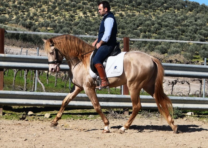 Carattere dolce, tranquillo, curioso, giocoso e affettuoso. Montato in passo, trotto e galoppo su terreno. Di statura grande, di stampo barocco, comodo, stallone da monta, con colore speciale, Baya Perla (CrPrl) con pedigree PRE. Radiografie di buona qualità e Piro negativo. Pedigree: Antonio Guiral Guarga, Castillo Villafranca, Paco Marti. www.elegante-andalusier.com