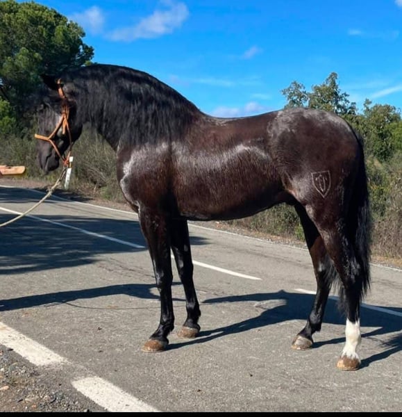 Cavallo stallone PRE nero di 4 anni, alto 1,65 m al garrese, molto barocco e affascinante, con una criniera e una coda splendide. Iscritto all'ANCCE. Già avviato alla doma e sotto la sella, ha già percorso anche il lavoro di base sia in arena che all'aperto, anche in strada, con un carattere molto buono.