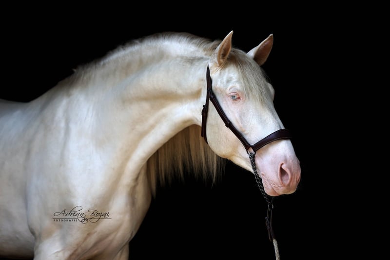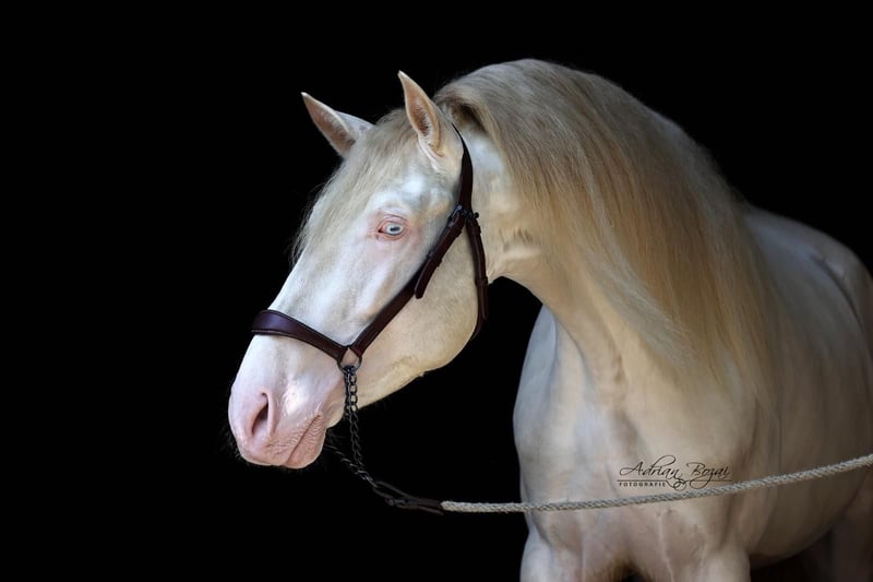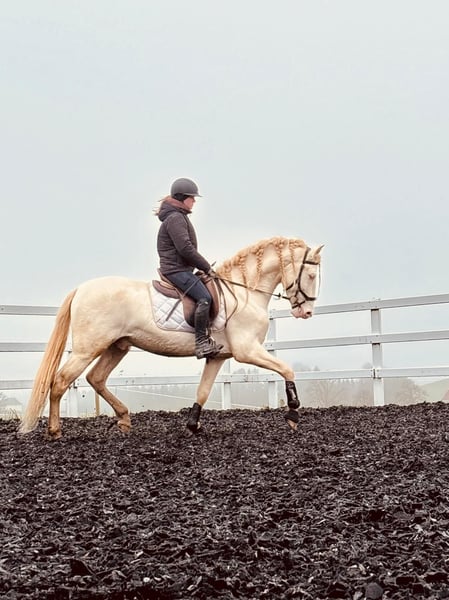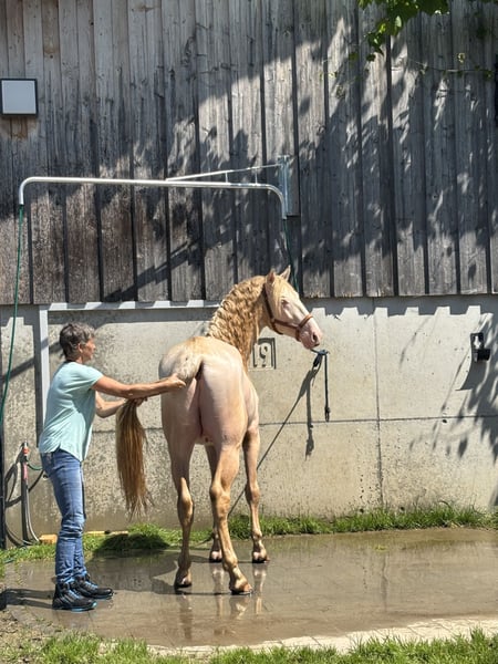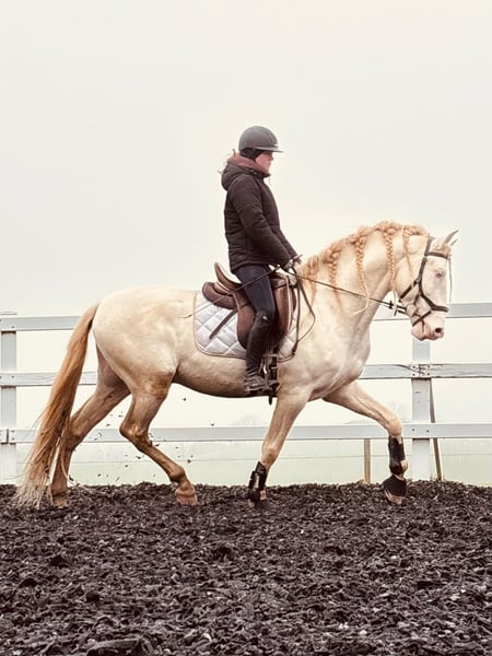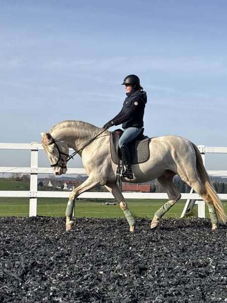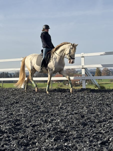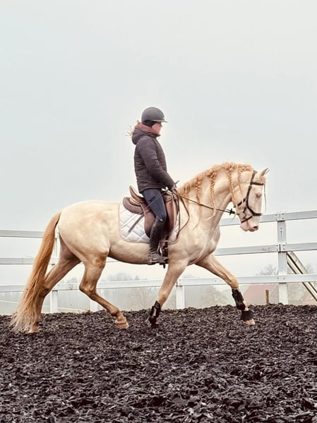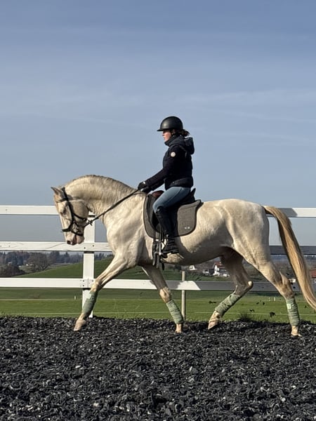 REY SH, the king of the stable. With his extraordinary color and crystal blue eyes, he attracts everyone's attention. He is absolutely charming and affectionate towards his humans. This horse is not only a visual highlight because of his color; his beautiful conformation and his ability to move gracefully make him a promising equine partner. Due to his color, REY is a special gem that requires appropriate care. Horses of this color need more attention and intensive grooming. They are often a bit slower in physical maturity compared to their peers. Thanks to his sweet character, he makes it easy for his trainers. Although he is still a bit soft in his foundation, he can be reliably ridden in all three gaits. The unicorn enjoys little excursions in our fairy tale forest. Due to his color with the double pearl gene, he is also an interesting horse for breeders, capable of passing on special colors such as Bayo, Perlino, Bayo Perla, etc. He has already received his approval. REY SH has grown up in a species-appropriate manner at his breeder in Galicia and has been happily roaming in a herd on extensive grounds. Great emphasis is placed on good feed management and regular deworming. His hooves are also regularly checked and treated as needed. He has never had negative experiences, so he gives his full trust to humans. General information for getting to know our horses: The horses are usually either unstarted or gently started when they come to us. We make every effort to introduce the horses to the riding life in a trusting manner. We are happy to present the horses on the lunge and under the rider. If there is serious interest in purchasing, trial rides and groundwork sessions are, of course, possible. A protection fee of 50 euros per visit is charged during the viewing period. This protects our sale horses from the trend of trial tourism. We have found that our horse buyers appreciate that their future horse has not been tried by too many hands. Thank you for your understanding. You are also welcome to combine your horse search with a few days of vacation. Our cozy holiday apartments directly at the stud allow you to get to know the horses 24 hours a day. For more information or to schedule a viewing appointment, please contact us. We look forward to hearing from you!