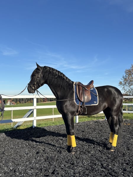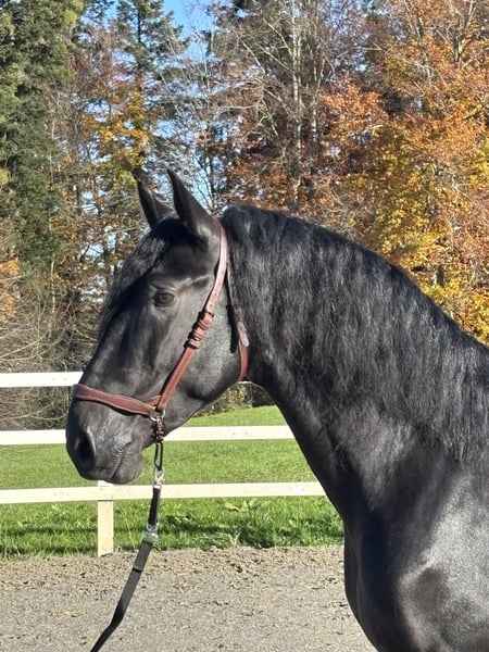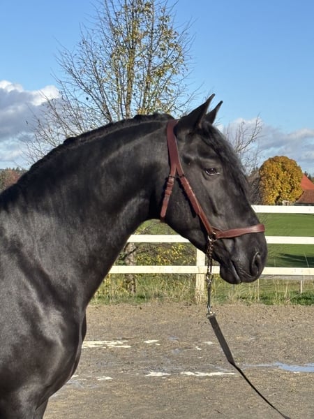 For sale is this exceptional, licensed black stallion, RAHEGO SH. A stunning son of DIVORCIADO from the renowned YEGUADA VALDEOLIVAS breeding program. This extraordinary stallion impresses not only with his size and unique beauty but also with his high-quality basic gaits. His walk is outstanding, his trot mechanics are convincing, and he exhibits a beautiful uphill canter. It is rare to find such movement potential in PREs of this caliber. He has been gently and age-appropriately trained and developed directly by the breeder. RAHEGO SH displays a completely clear mind and is not stallion-like. He possesses a consistently honest character and is a true dream horse. Anyone seeking a soulmate should take a close look at him. Veterinary certificate available, with no notable findings. General information about getting to know our horses: We make every effort to introduce the horses to a trusting riding life. We are happy to present the horses lunged and under saddle. Serious buyers are, of course, welcome to try riding and work from the ground. A viewing fee of 50 euros per visit applies to help us protect our sale horses from the current trend of excessive trial rides. We have found that our horse buyers appreciate that their future horse has not been tried by too many different hands. Thank you for your understanding. You are also welcome to combine your horse search with a few days of vacation. Our cozy holiday apartments directly on the stud farm allow you to get to know the horses around the clock. If you are interested or need further information, I am happy to assist. Please contact me to learn more about this charming leisure mare!
