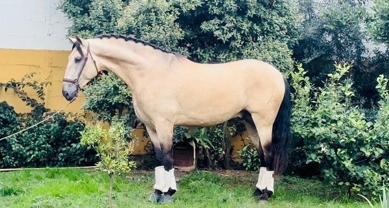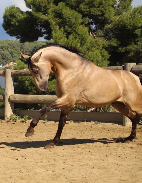 Nuestro semental PRE apto reproductor en el color especial Bayo (dun) tiene un gran carácter, está dispuesto a trabajar pero siempre manejable y tiene mucho potencial. Actualmente se está domando y ya camina, trota y galopea bajo el jinete. ¡Videos y más información a petición!
